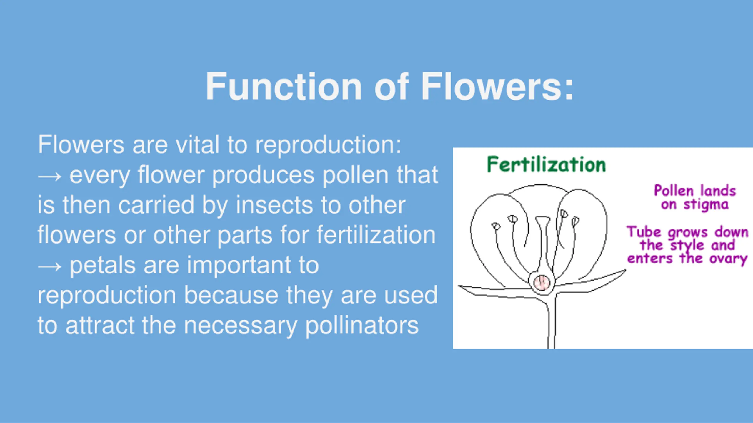 Function of Flowers: Flowers are vital to reproduction: every flower produces pollen that is then carried by insects to other flowers or other parts for fertilization petals are important to reproduction because they are used to attract the necessary pollinators