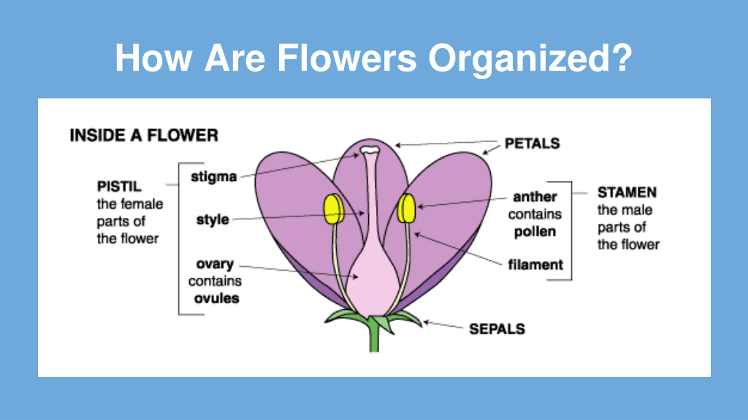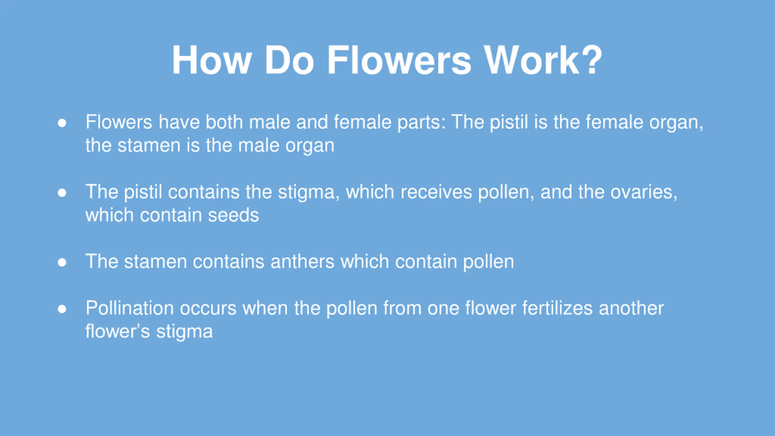 How Do Flowers Work? Flowers have both male and female parts: The pistil is the female organ, the stamen is the male organ The pistil contains the stigma, which receives pollen, and the ovaries, which contain seeds The stamen contains anthers which contain pollen Pollination occurs when the pollen from one flower fertilizes another flower s stigma