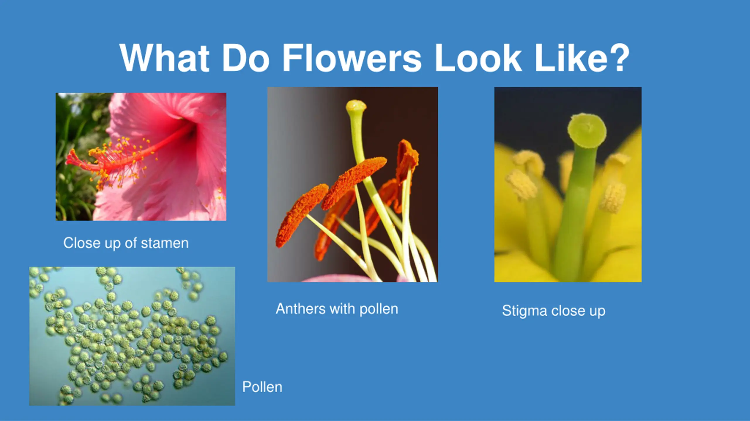 What Do Flowers Look Like? Close up of stamen Anthers with pollen Stigma close up Pollen