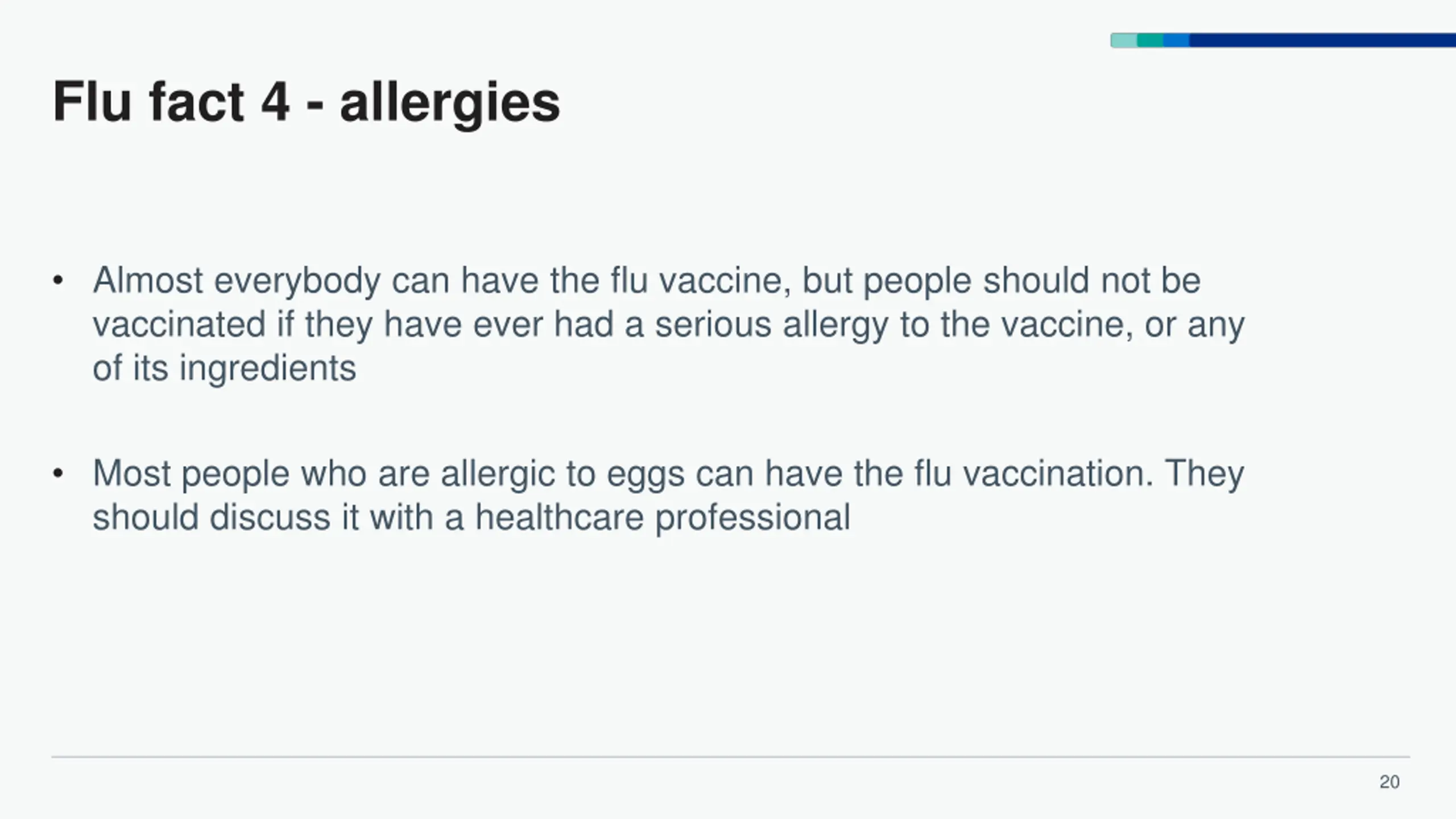 Flu fact 4 - allergies Almost everybody can have the flu vaccine, but people should not be vaccinated if they have ever had a serious allergy to the vaccine, or any of its ingredients Most people who are allergic to eggs can have the flu vaccination. They should discuss it with a healthcare professional 20