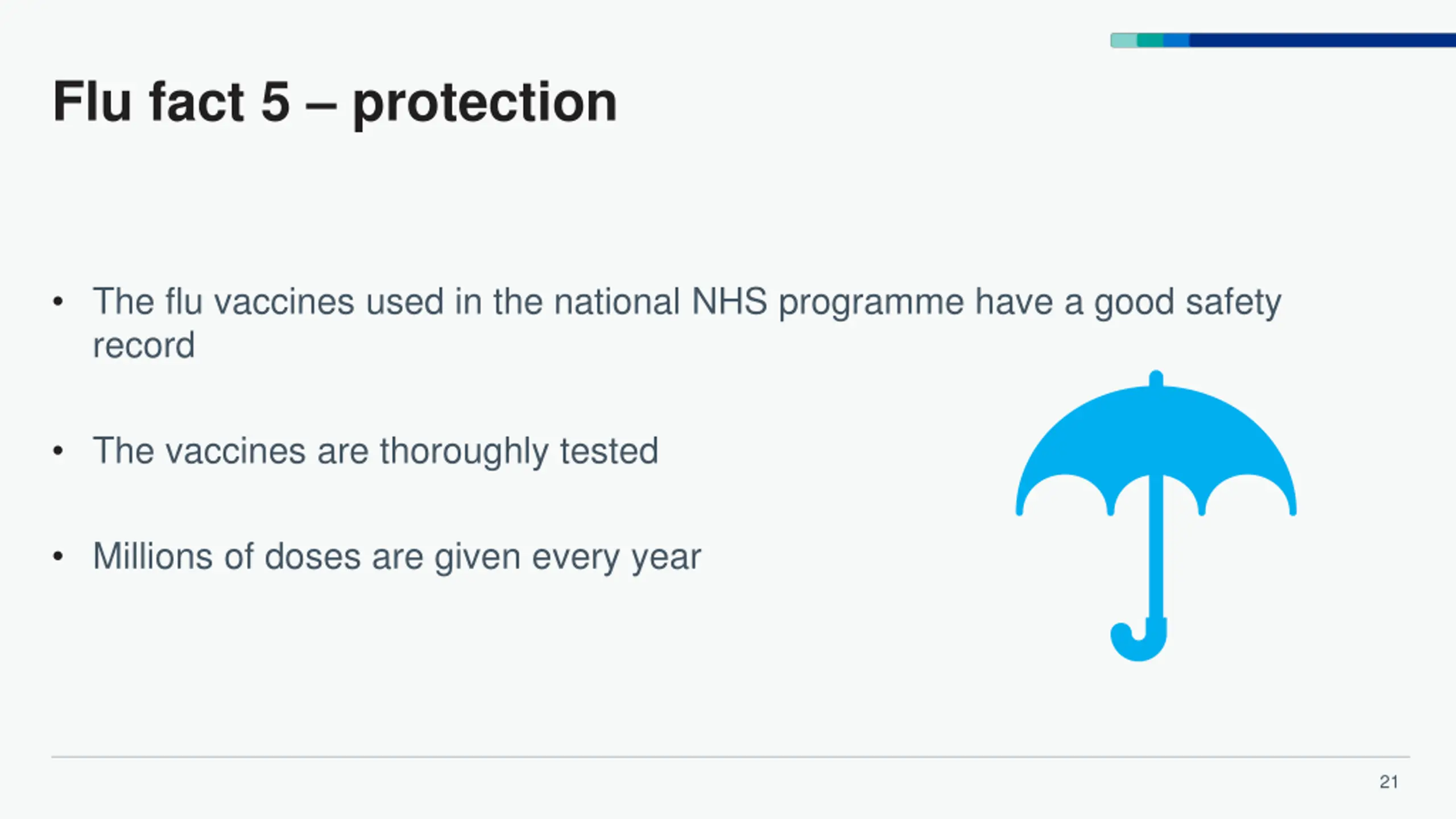 Flu fact 5 protection The flu vaccines used in the national NHS programme have a good safety record The vaccines are thoroughly tested Millions of doses are given every year 21