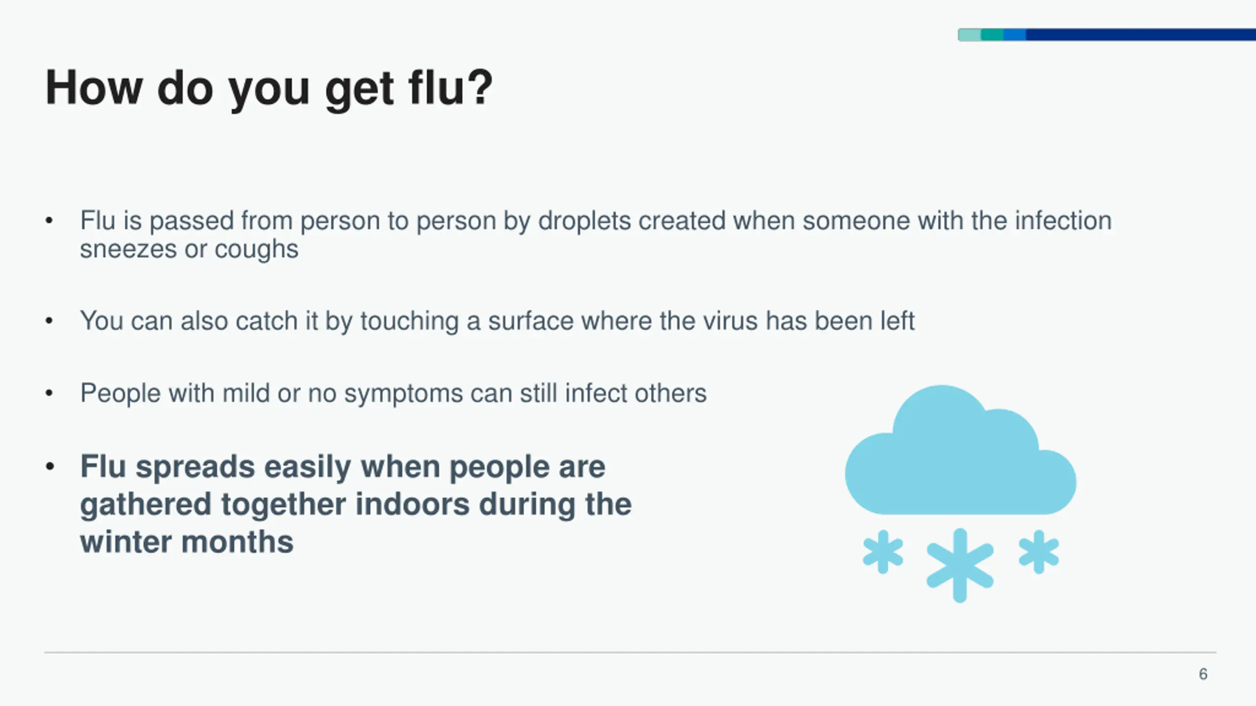 How do you get flu? Flu is passed from person to person by droplets created when someone with the infection sneezes or coughs You can also catch it by touching a surface where the virus has been left People with mild or no symptoms can still infect others Flu spreads easily when people are gathered together indoors during the winter months 6