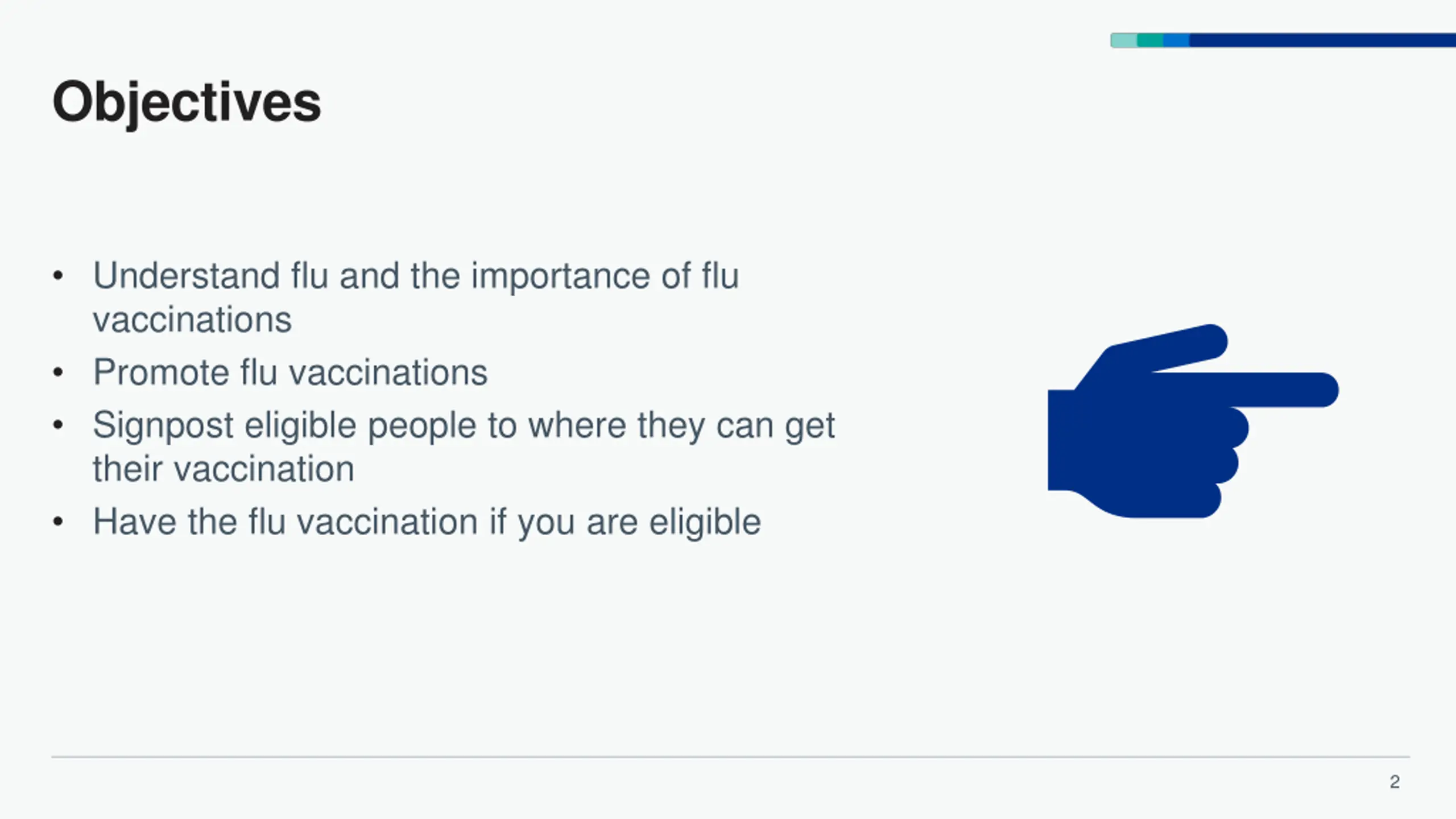 Objectives Understand flu and the importance of flu vaccinations Promote flu vaccinations Signpost eligible people to where they can get their vaccination Have the flu vaccination if you are eligible 2