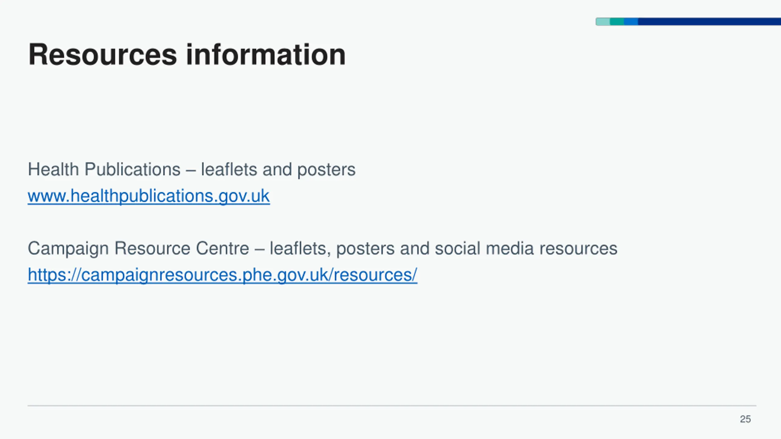 Resources information Health Publications leaflets and posters www.healthpublications.gov.uk Campaign Resource Centre leaflets, posters and social media resources https://campaignresources.phe.gov.uk/resources/ 25