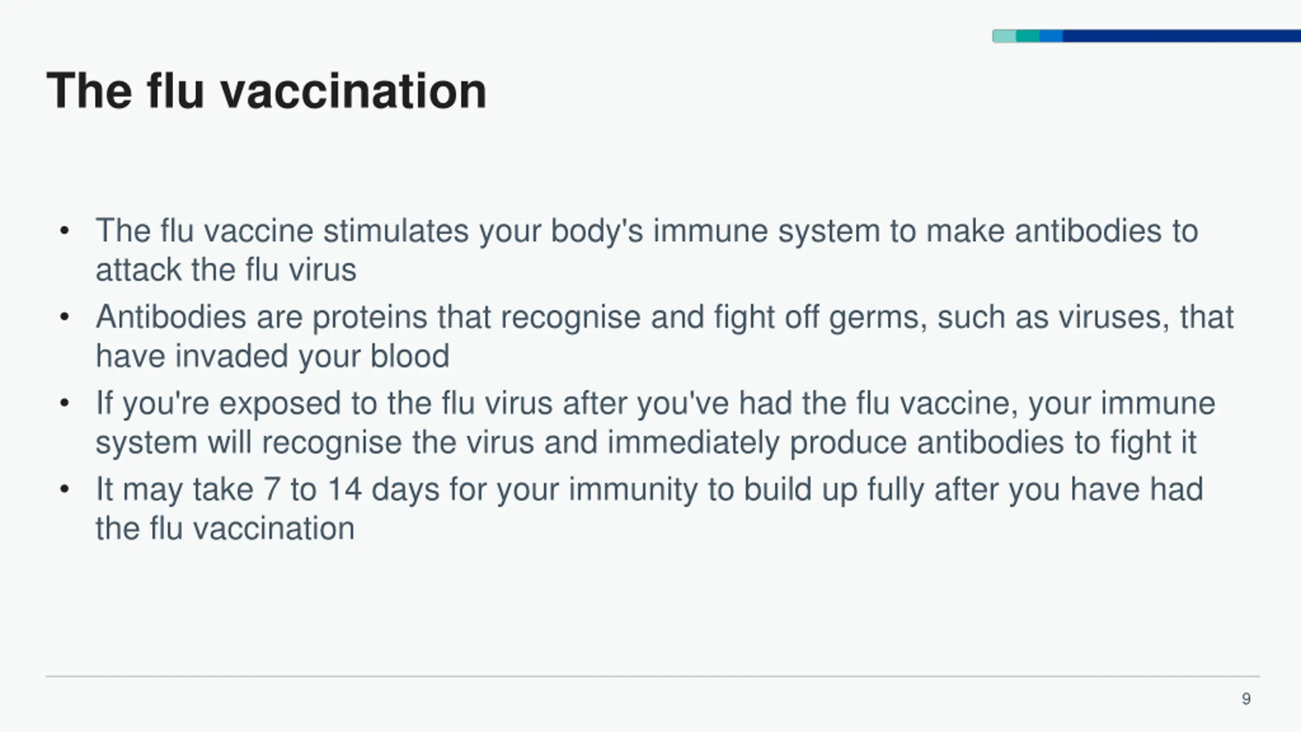 The flu vaccination The flu vaccine stimulates your body's immune system to make antibodies to attack the flu virus Antibodies are proteins that recognise and fight off germs, such as viruses, that have invaded your blood If you're exposed to the flu virus after you've had the flu vaccine, your immune system will recognise the virus and immediately produce antibodies to fight it It may take 7 to 14 days for your immunity to build up fully after you have had the flu vaccination 9