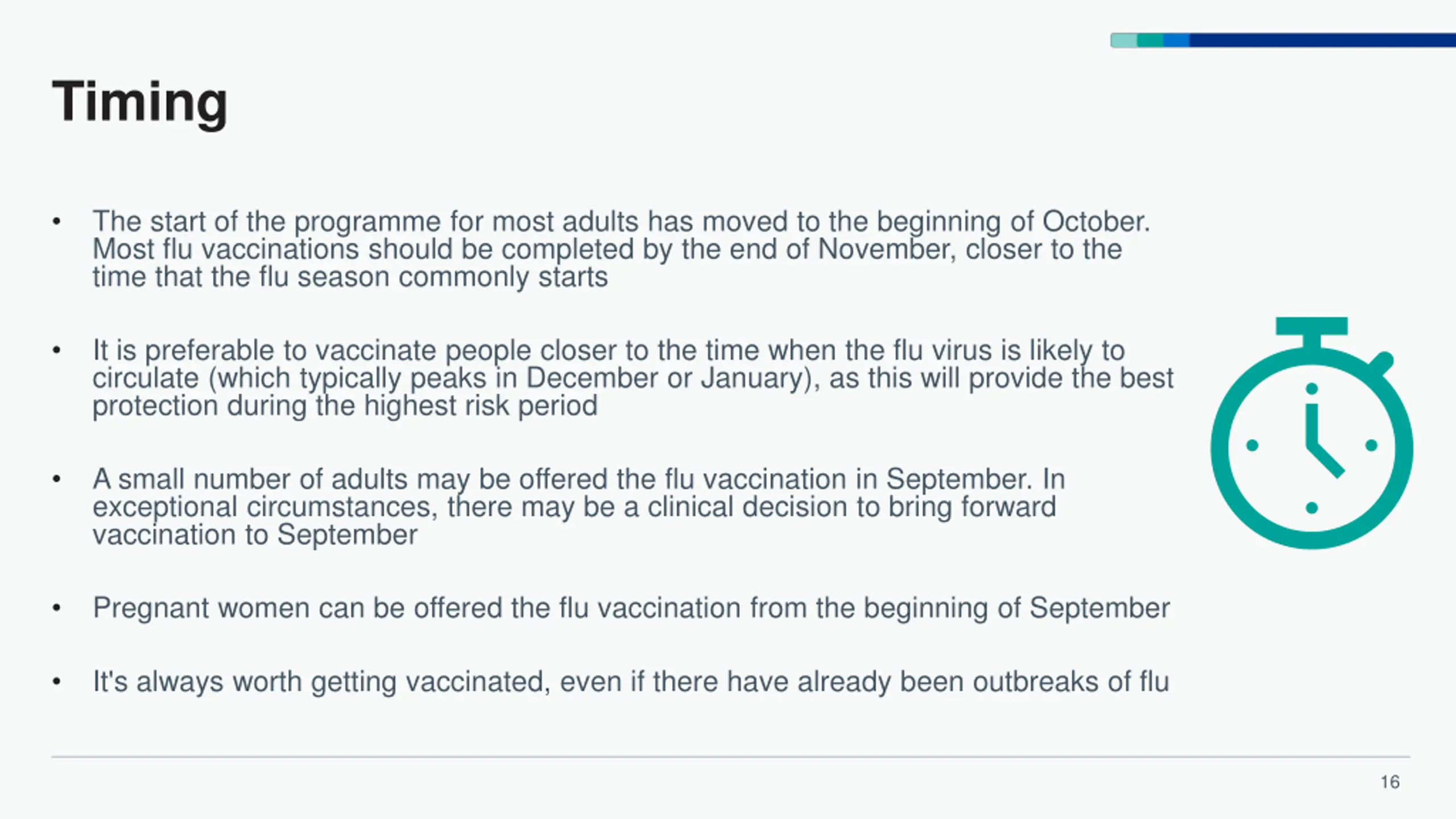 Timing The start of the programme for most adults has moved to the beginning of October. Most flu vaccinations should be completed by the end of November, closer to the time that the flu season commonly starts It is preferable to vaccinate people closer to the time when the flu virus is likely to circulate (which typically peaks in December or January), as this will provide the best protection during the highest risk period A small number of adults may be offered the flu vaccination in September. In exceptional circumstances, there may be a clinical decision to bring forward vaccination to September Pregnant women can be offered the flu vaccination from the beginning of September It's always worth getting vaccinated, even if there have already been outbreaks of flu 16