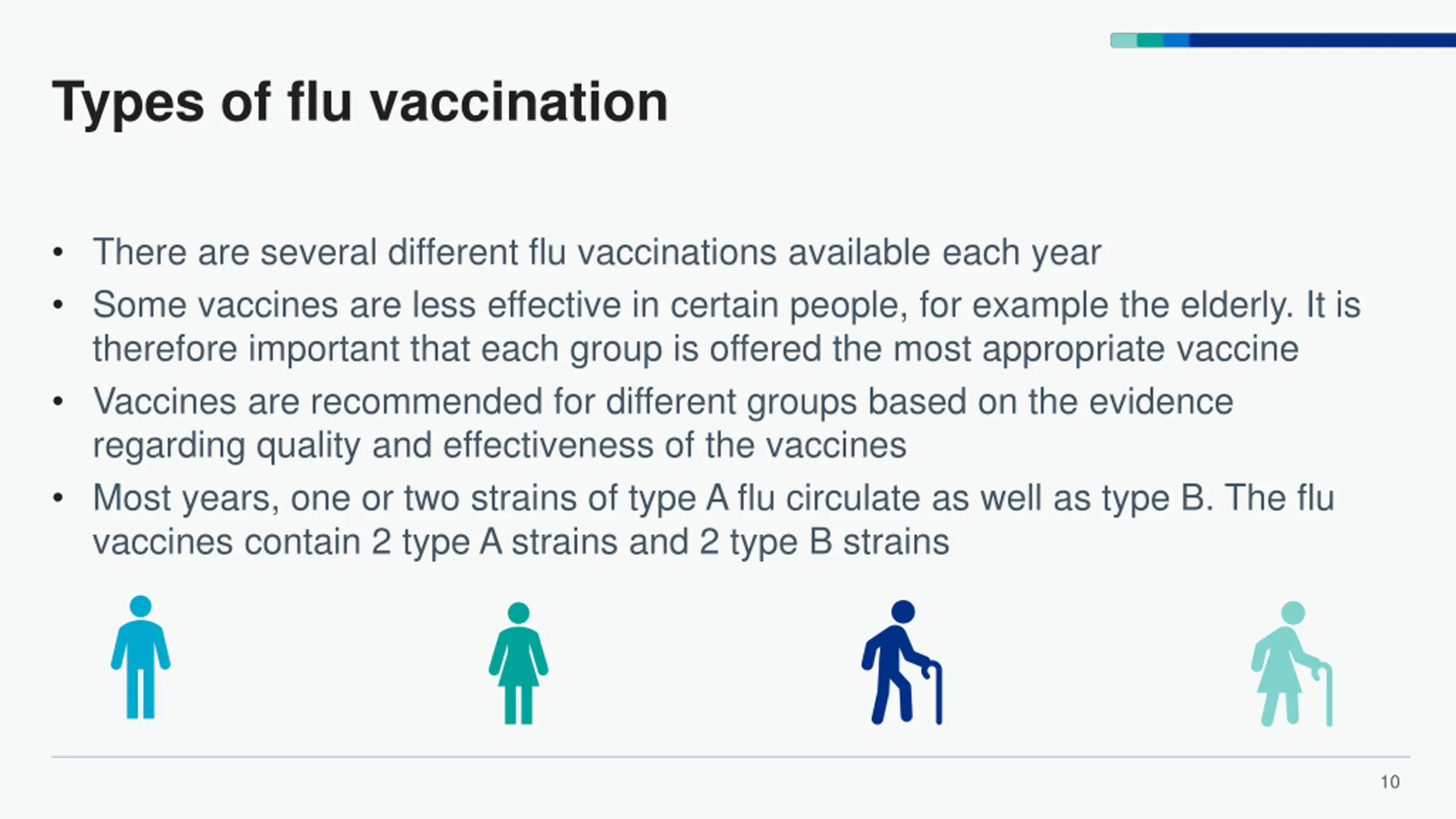 Types of flu vaccination There are several different flu vaccinations available each year Some vaccines are less effective in certain people, for example the elderly. It is therefore important that each group is offered the most appropriate vaccine Vaccines are recommended for different groups based on the evidence regarding quality and effectiveness of the vaccines Most years, one or two strains of type A flu circulate as well as type B. The flu vaccines contain 2 type A strains and 2 type B strains 10