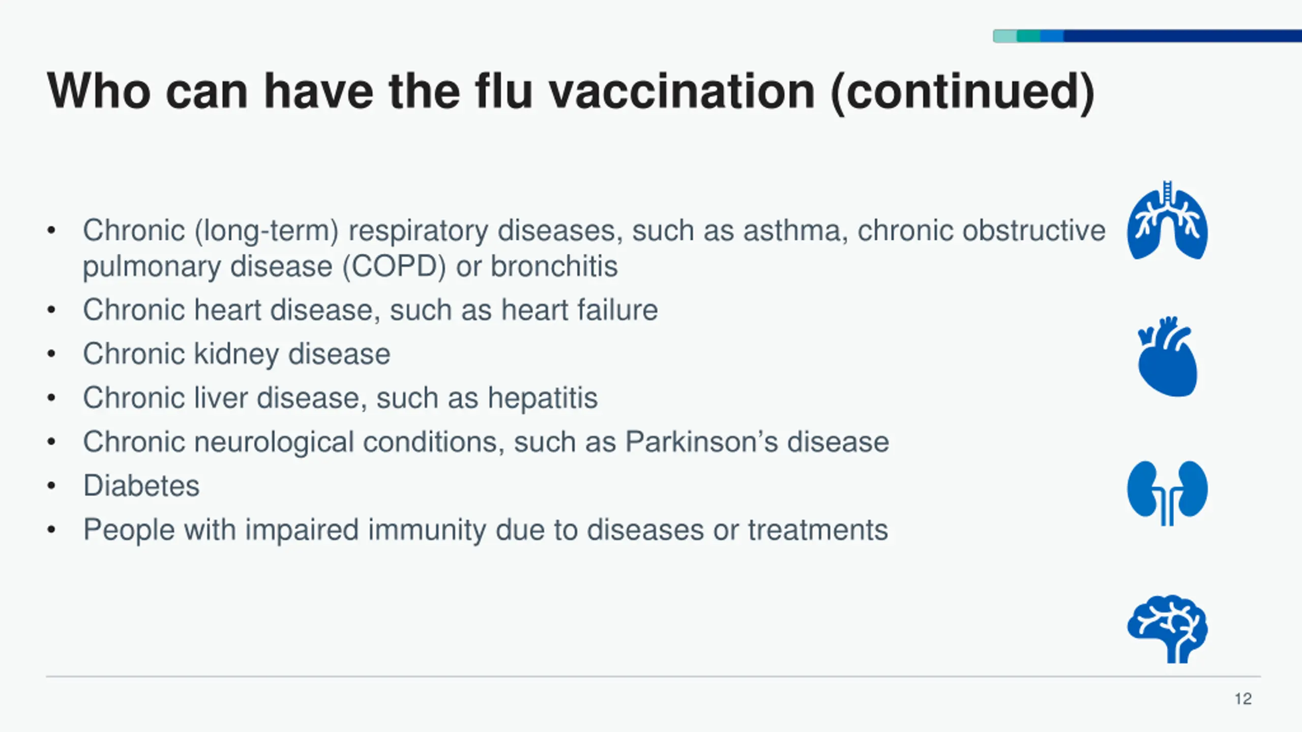 Who can have the flu vaccination (continued) Chronic (long-term) respiratory diseases, such as asthma, chronic obstructive pulmonary disease (COPD) or bronchitis Chronic heart disease, such as heart failure Chronic kidney disease Chronic liver disease, such as hepatitis Chronic neurological conditions, such as Parkinson s disease Diabetes People with impaired immunity due to diseases or treatments 12