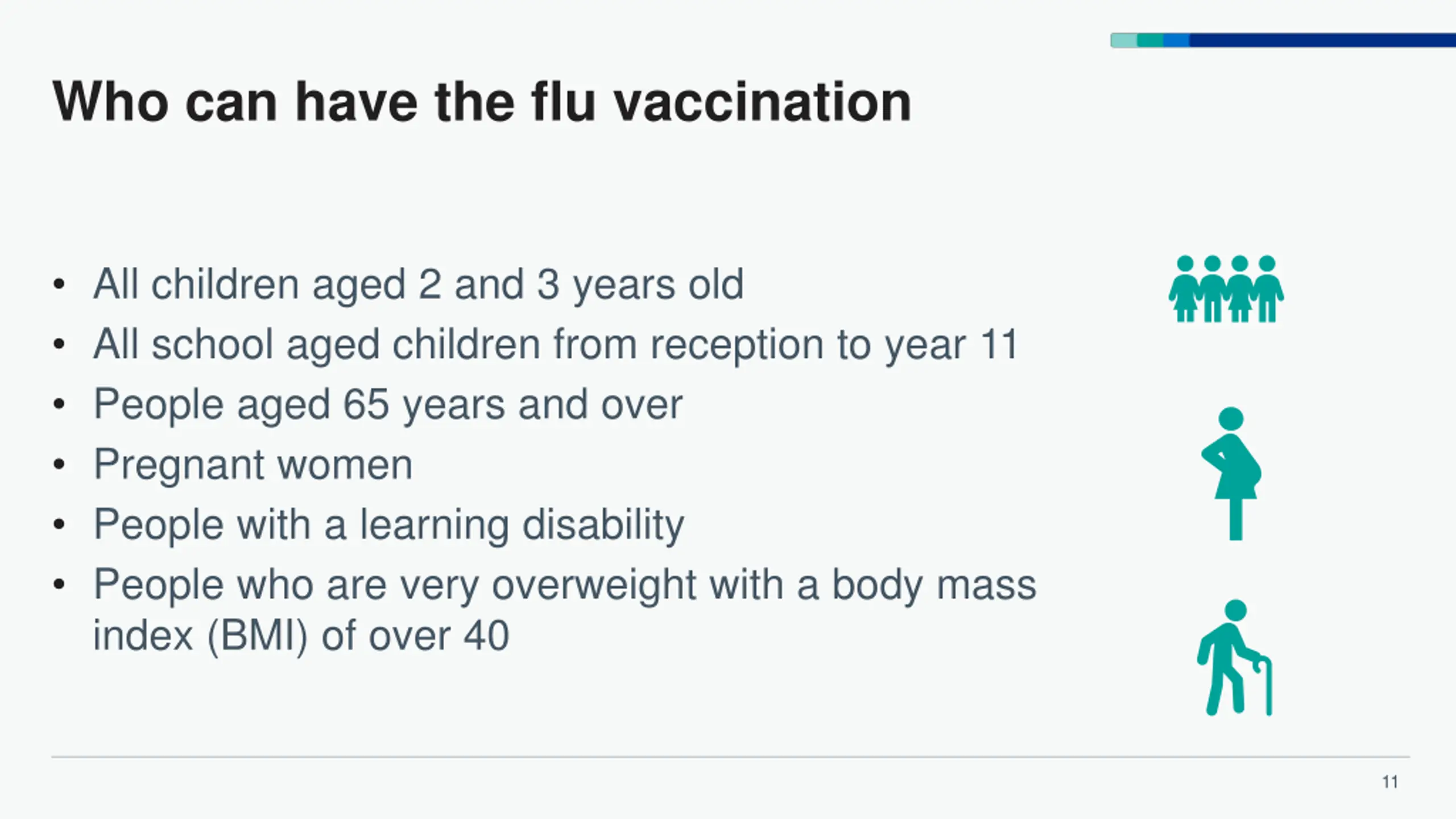 Who can have the flu vaccination All children aged 2 and 3 years old All school aged children from reception to year 11 People aged 65 years and over Pregnant women People with a learning disability People who are very overweight with a body mass index (BMI) of over 40 11