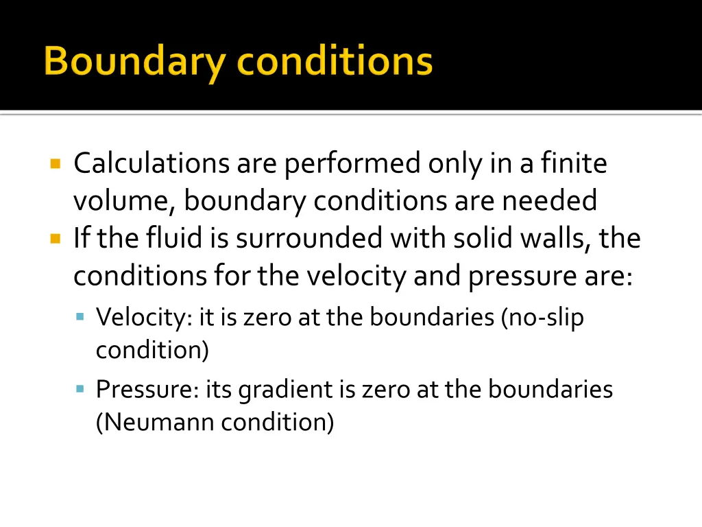 Calculations are performed only in a finite volume, boundary conditions are needed If the fluid is surrounded with solid walls, the conditions for the velocity and pressure are: Velocity: it is zero at the boundaries (no-slip condition) Pressure: its gradient is zero at the boundaries (Neumann condition)