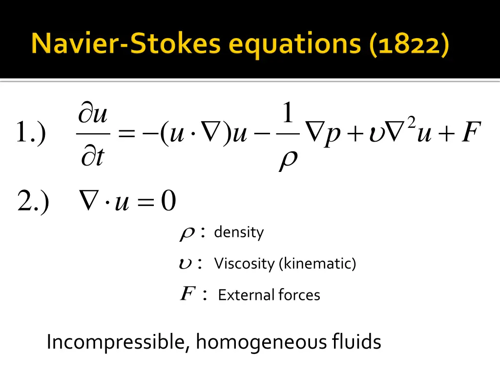 1 u = + + 2 1 .) ( ) u u p u F t = 2 .) 0 u : density : Viscosity (kinematic) : F External forces Incompressible, homogeneous fluids