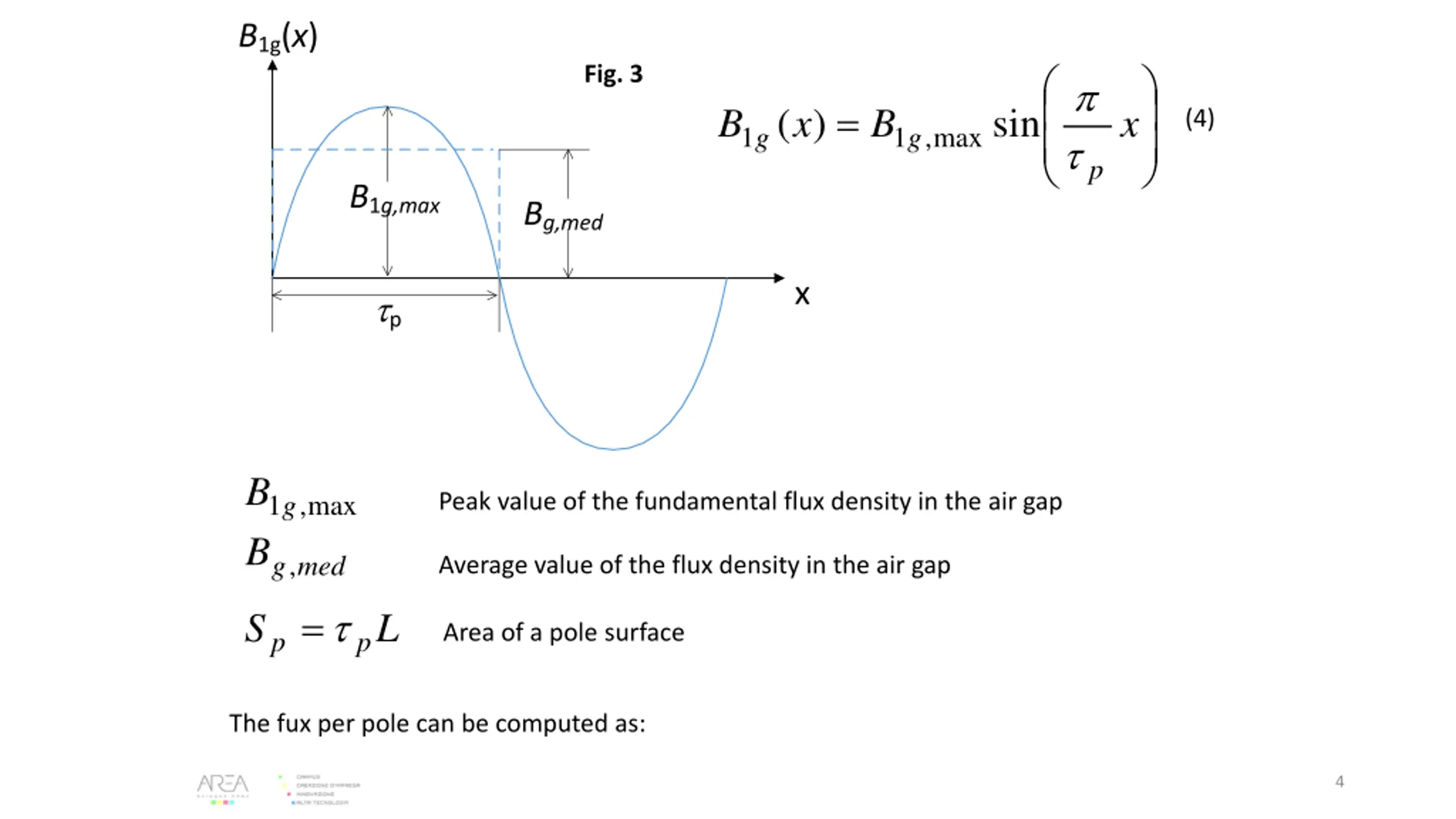 B1g(x) Fig. 3 = ( ) sin B x B x (4) 1 1 , max g g t p B1g,max Bg,med x tp B B, 1g , max Peak value of the fundamental flux density in the air gap g med = Average value of the flux density in the air gap t S L Area of a pole surface p p The fux per pole can be computed as: 4