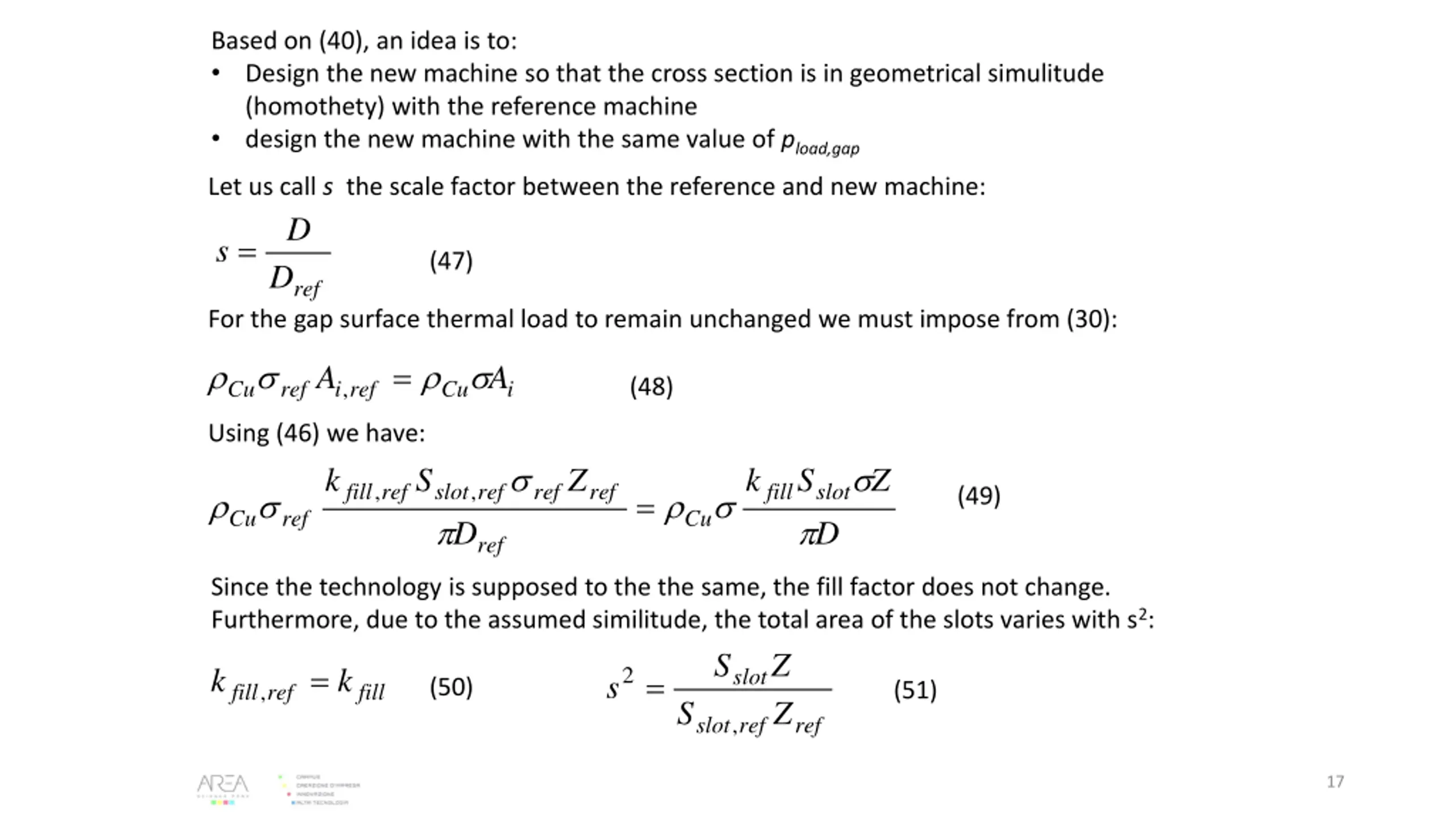 Based on (40), an idea is to: Design the new machine so that the cross section is in geometrical simulitude (homothety) with the reference machine design the new machine with the same value of pload,gap Let us call s the scale factor between the reference and new machine: D s = (47) D ref For the gap surface thermal load to remain unchanged we must impose from (30): = A A (48) , Cu ref i ref Cu i Using (46) we have: k S Z k S Z , , fill ref slot ref ref ref fill slot (49) = Cu ref Cu D D ref Since the technology is supposed to the the same, the fill factor does not change. Furthermore, due to the assumed similitude, the total area of the slots varies with s2: S Z = k k 2= slot s (50) (51) , fill ref fill S Z , slot ref ref 17