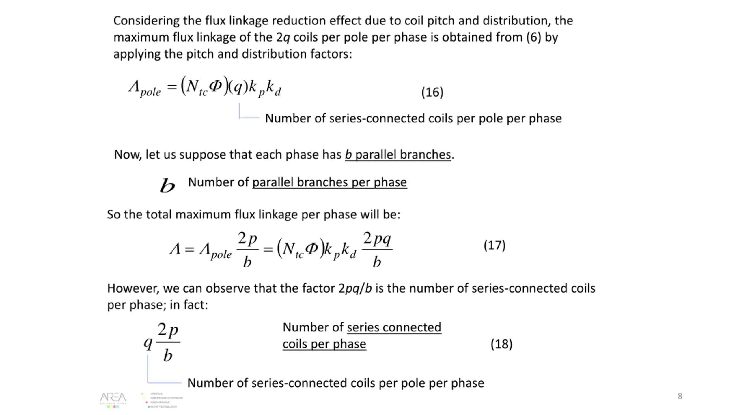 Considering the flux linkage reduction effect due to coil pitch and distribution, the maximum flux linkage of the 2q coils per pole per phase is obtained from (6) by applying the pitch and distribution factors: ( ) d p tc pole k k q N ) ( = (16) Number of series-connected coils per pole per phase Now, let us suppose that each phase has b parallel branches. b Number of parallel branches per phase So the total maximum flux linkage per phase will be: p pole = 2 2 pq ( ) = N k k (17) tc p d b b However, we can observe that the factor 2pq/b is the number of series-connected coils per phase; in fact: q2 p Number of series connected coils per phase (18) b Number of series-connected coils per pole per phase 8