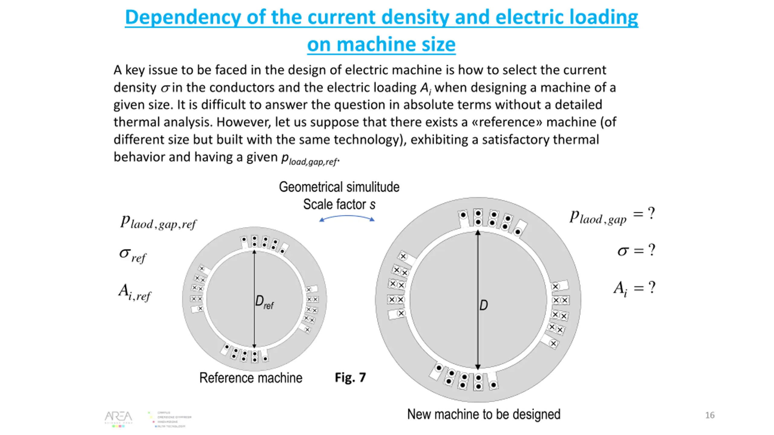 Dependency of the current density and electric loading on machine size A key issue to be faced in the design of electric machine is how to select the current density in the conductors and the electric loading Aiwhen designing a machine of a given size. It is difficult to answer the question in absolute terms without a detailed thermal analysis. However, let us suppose that there exists a reference machine (of different size but built with the same technology), exhibiting a satisfactory thermal behavior and having a given pload,gap,ref. Geometrical simulitude Scale factor s = ? p p , laod gap , , laod gap ref = ? ref = ? iA iA, ref Dref D Reference machine Fig. 7 New machine to be designed 16