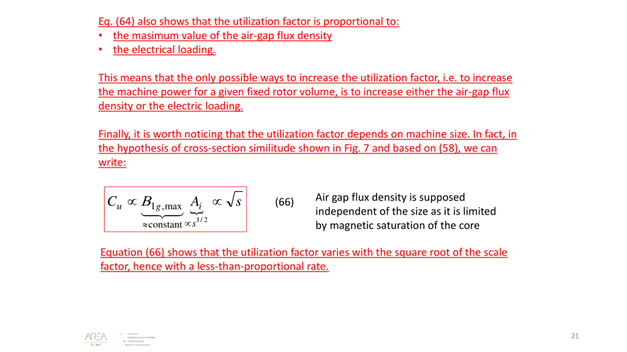 Eq. (64) also shows that the utilization factor is proportional to: the masimum value of the air-gap flux density the electrical loading. This means that the only possible ways to increase the utilization factor, i.e. to increase the machine power for a given fixed rotor volume, is to increase either the air-gap flux density or the electric loading. Finally, it is worth noticing that the utilization factor depends on machine size. In fact, in the hypothesis of cross-section similitude shown in Fig. 7 and based on (58), we can write: Air gap flux density is supposed independent of the size as it is limited by magnetic saturation of the core C A s (66) 1 , max u g i s / 1 2 constant Equation (66) shows that the utilization factor varies with the square root of the scale factor, hence with a less-than-proportional rate. 21