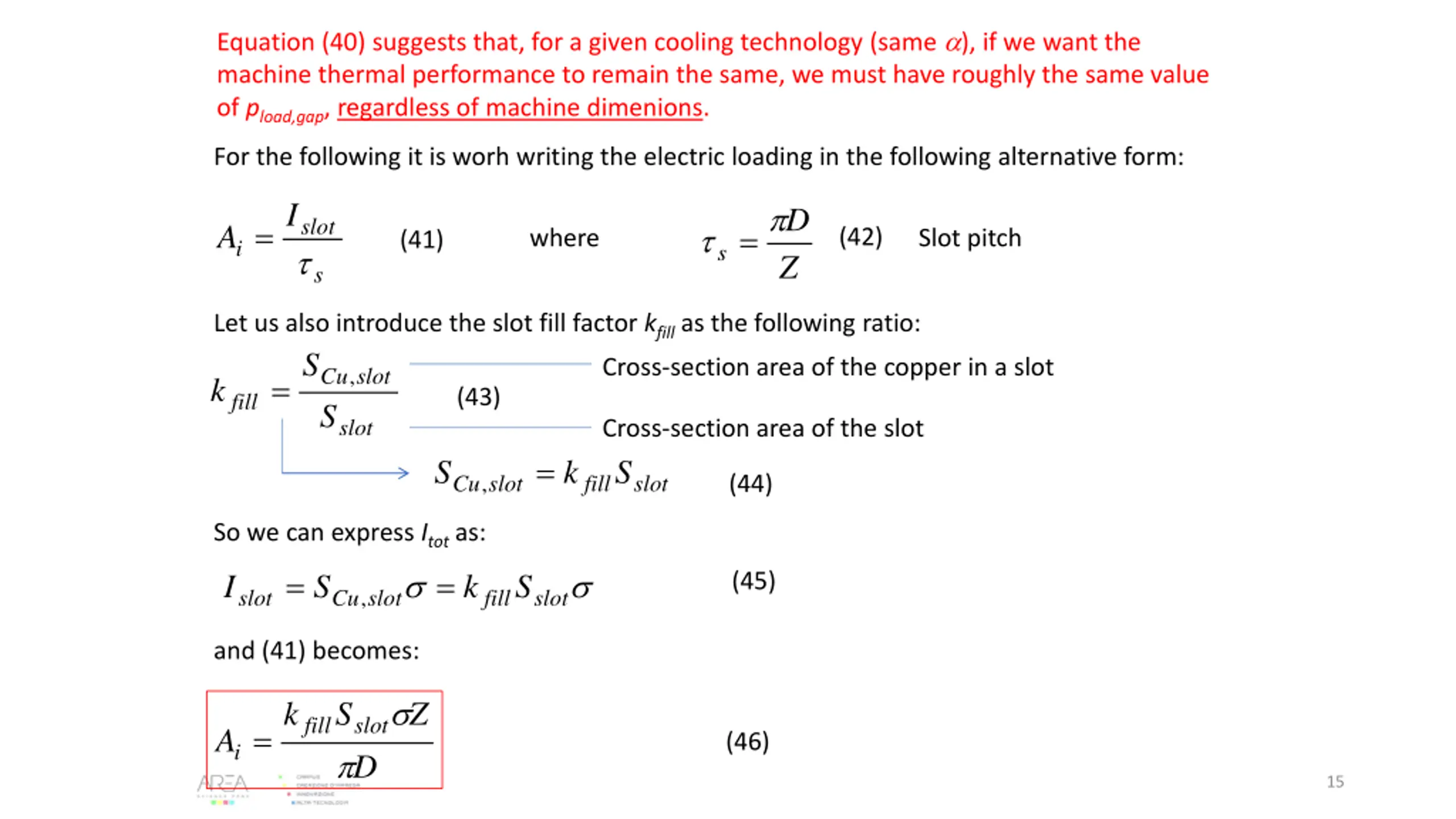 Equation (40) suggests that, for a given cooling technology (same ), if we want the machine thermal performance to remain the same, we must have roughly the same value of pload,gap, regardless of machine dimenions. For the following it is worh writing the electric loading in the following alternative form: I D slot t = A t = (42) where Slot pitch (41) i s Z s Let us also introduce the slot fill factor kfillas the following ratio: S k = (43) Cross-section area of the copper in a slot , Cu S slot fill slot Cross-section area of the slot S (44) = S k , Cu slot fill slot So we can express Itotas: S I = = k S (45) , slot Cu slot fill slot and (41) becomes: k S Z fill slot = A (46) i D 15