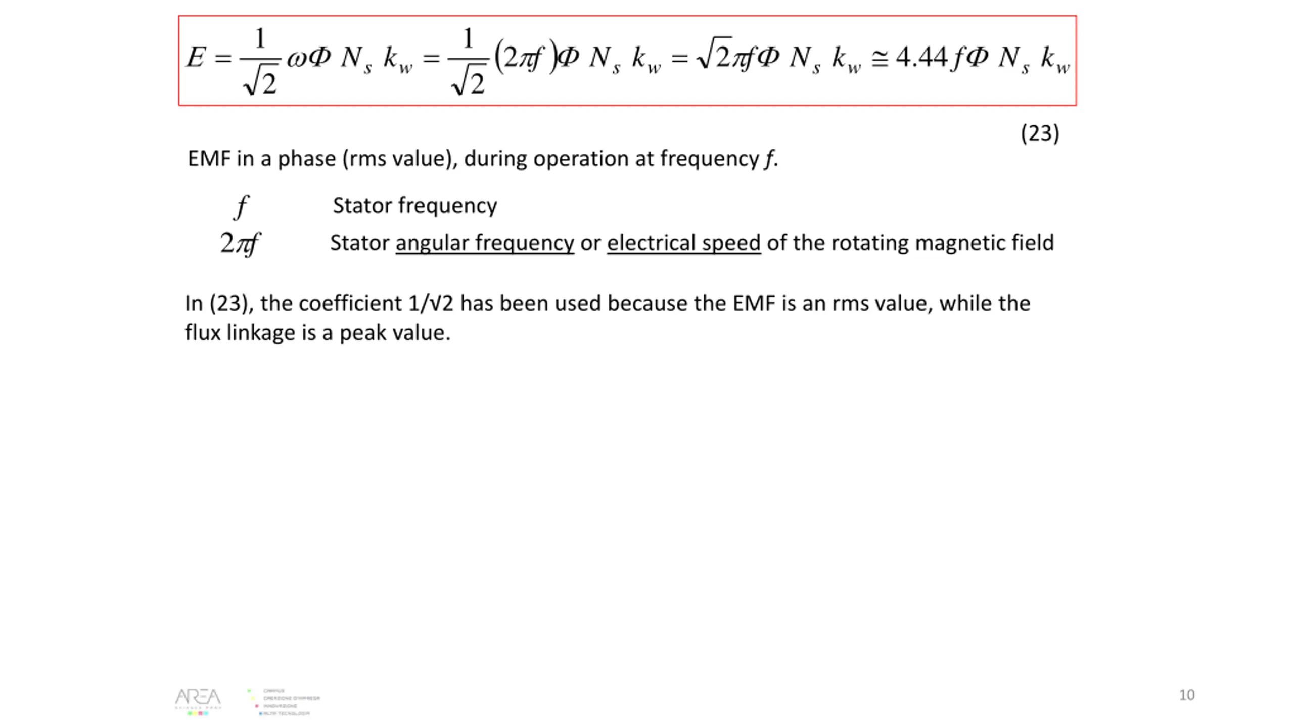 1 1 ( ) = = 2 = 2 . 4 44 N k f N k f N k f N k s w s w s w s w 2 2 (23) EMF in a phase (rms value), during operation at frequency f. f Stator frequency f 2 Stator angular frequency or electrical speed of the rotating magnetic field In (23), the coefficient 1/ 2 has been used because the EMF is an rms value, while the flux linkage is a peak value. 10