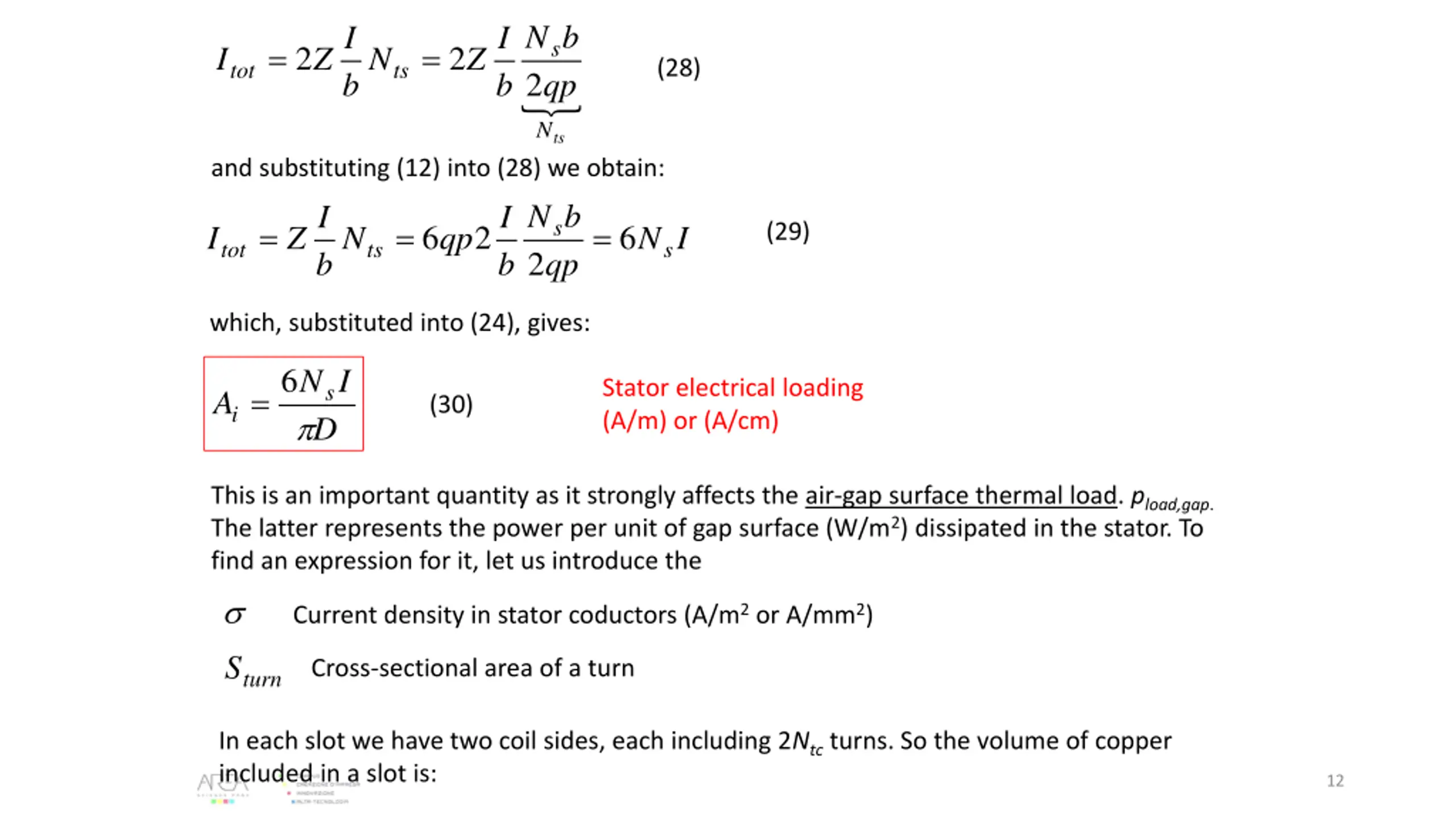 N 2 b I I s = = 2 2 I Z N Z (28) tot ts b b qp N ts and substituting (12) into (28) we obtain: I Z I ts tot 6 = = N 2 b I s = 2 6 N qp N I (29) s b b qp which, substituted into (24), gives: 6 N I Stator electrical loading (A/m) or (A/cm) s = A (30) i D This is an important quantity as it strongly affects the air-gap surface thermal load. pload,gap. The latter represents the power per unit of gap surface (W/m2) dissipated in the stator. To find an expression for it, let us introduce the Current density in stator coductors (A/m2or A/mm2) S Cross-sectional area of a turn turn In each slot we have two coil sides, each including 2Ntcturns. So the volume of copper included in a slot is: 12