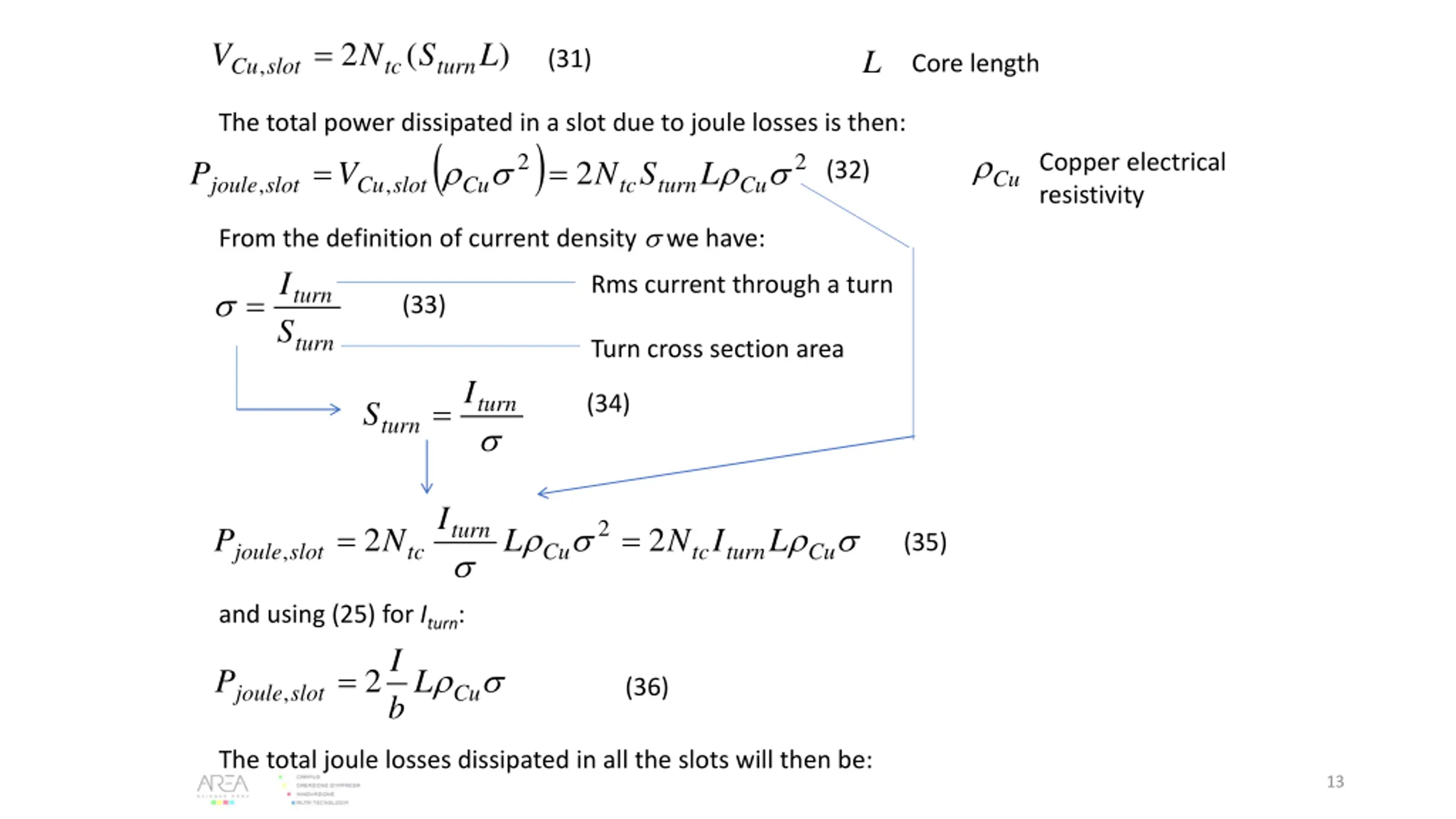 = 2 ( ) V N S L L (31) Core length , Cu slot tc turn The total power dissipated in a slot due to joule losses is then: ( , , Cu slot Cu slot joule V = = ) 2 2 Copper electrical resistivity 2 P N S L (32) Cu tc turn Cu From the definition of current density we have: I = (33) Rms current through a turn turn S turn Turn cross section area I turn = (34) S turn I 2 turn = = 2 2 P N L N I L (35) , joule slot tc Cu tc turn Cu and using (25) for Iturn: I = Cu L 2 P (36) , joule slot b The total joule losses dissipated in all the slots will then be: 13