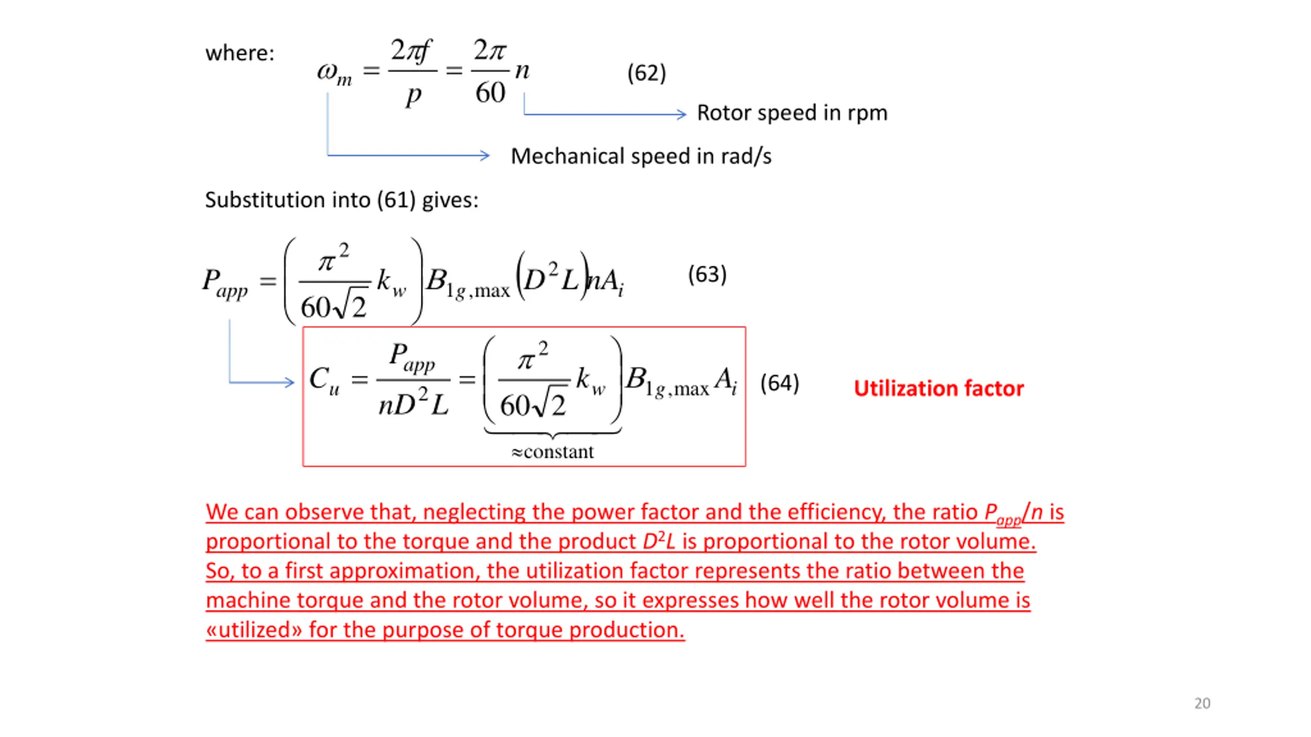 2 2 f where: = = n (62) m 60 p Rotor speed in rpm Mechanical speed in rad/s Substitution into (61) gives: ( ) 2 2 = app P k D L nA (63) 1 , max w g i 60 2 2 app P = = C k A (64) 1 , max u w g i Utilization factor 2 nD L 60 2 constant We can observe that, neglecting the power factor and the efficiency, the ratio Papp/n is proportional to the torque and the product D2L is proportional to the rotor volume. So, to a first approximation, the utilization factor represents the ratio between the machine torque and the rotor volume, so it expresses how well the rotor volume is utilized for the purpose of torque production. 20