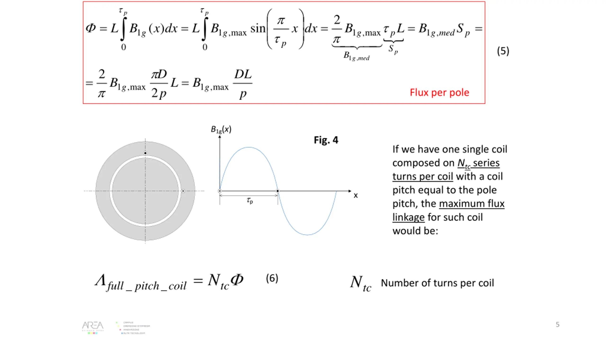 t t p p 2 = = = t = = ( ) sin L B x dx L B x dx B L B S 1 1 , max 1 , max 1 , g g g p g med p t S p 0 0 (5) p B 1 , g med 2 D DL = = B L B 1 , max 1 , max g g 2 p p Flux per pole B1g(x) Fig. 4 If we have one single coil composed on Ntcseries turns per coil with a coil pitch equal to the pole pitch, the maximum flux linkage for such coil would be: x tp = tc N N (6) Number of turns per coil _ _ full pitch coil tc 5