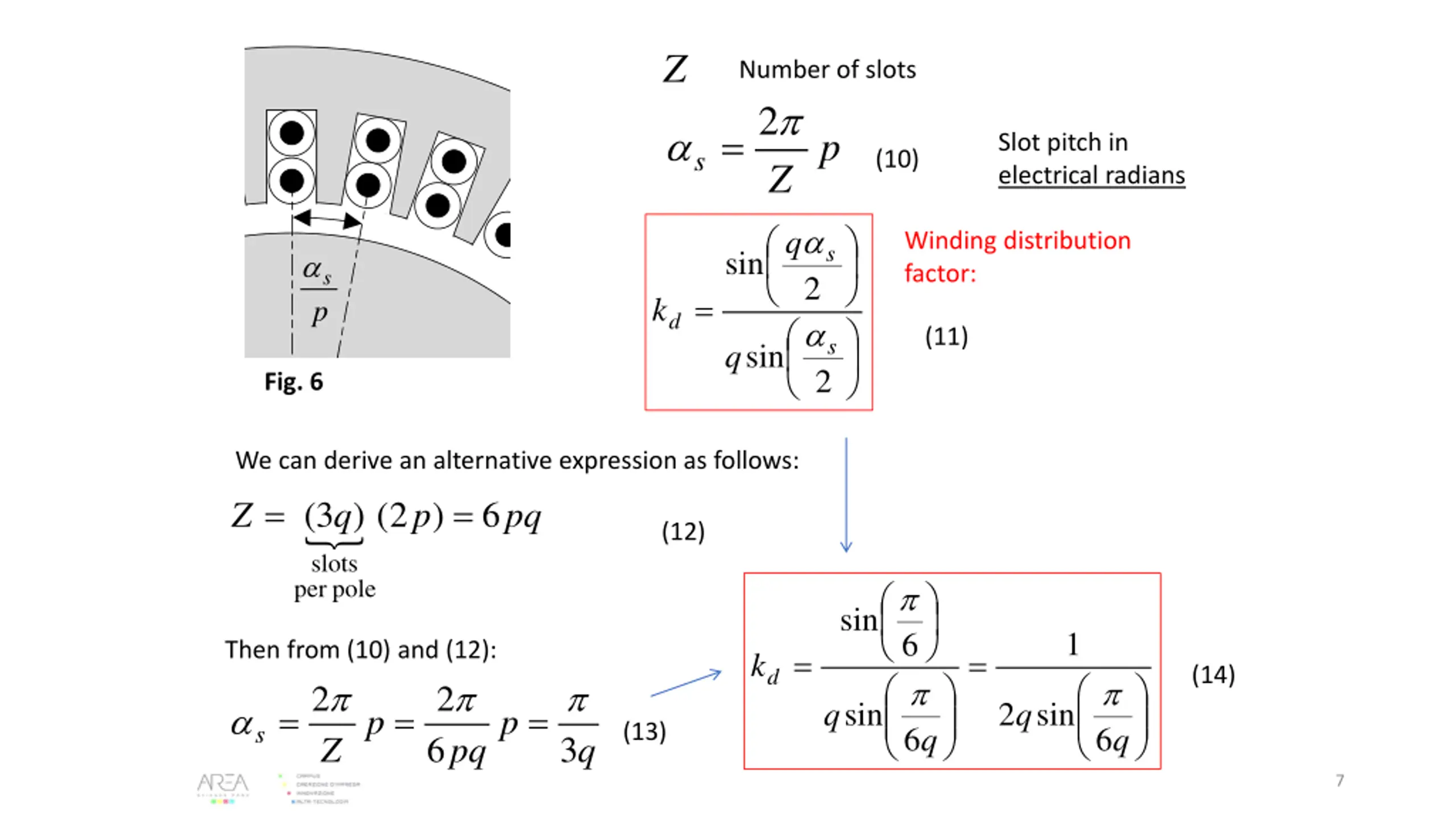 Z Number of slots 2 = p Slot pitch in electrical radians s (10) Z q Winding distribution factor: s sin s 2 = k p d (11) s sin q 2 Fig. 6 We can derive an alternative expression as follows: = = 3 ( ) 2 ( ) 6 Z q p pq slots (12) per pole sin 1 6 Then from (10) and (12): 2 = = = kd (14) 2 sin 2 sin q q = = p p (13) s 6 6 q q 6 3 Z pq q 7