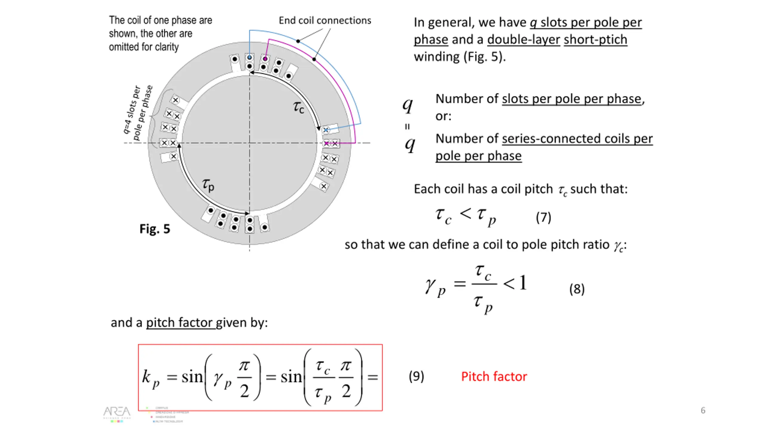 The coil of one phase are shown, the other are omitted for clarity End coil connections In general, we have q slots per pole per phase and a double-layer short-ptich winding (Fig. 5). q=4 slots per pole per phase q tc Number of slots per pole per phase, or: = q Number of series-connected coils per pole per phase tp Each coil has a coil pitch tcsuch that: t t c p (7) Fig. 5 so that we can define a coil to pole pitch ratio c: t c = 1 p (8) t p and a pitch factor given by: t c = = = sin sin k (9) Pitch factor p p t 2 2 p 6