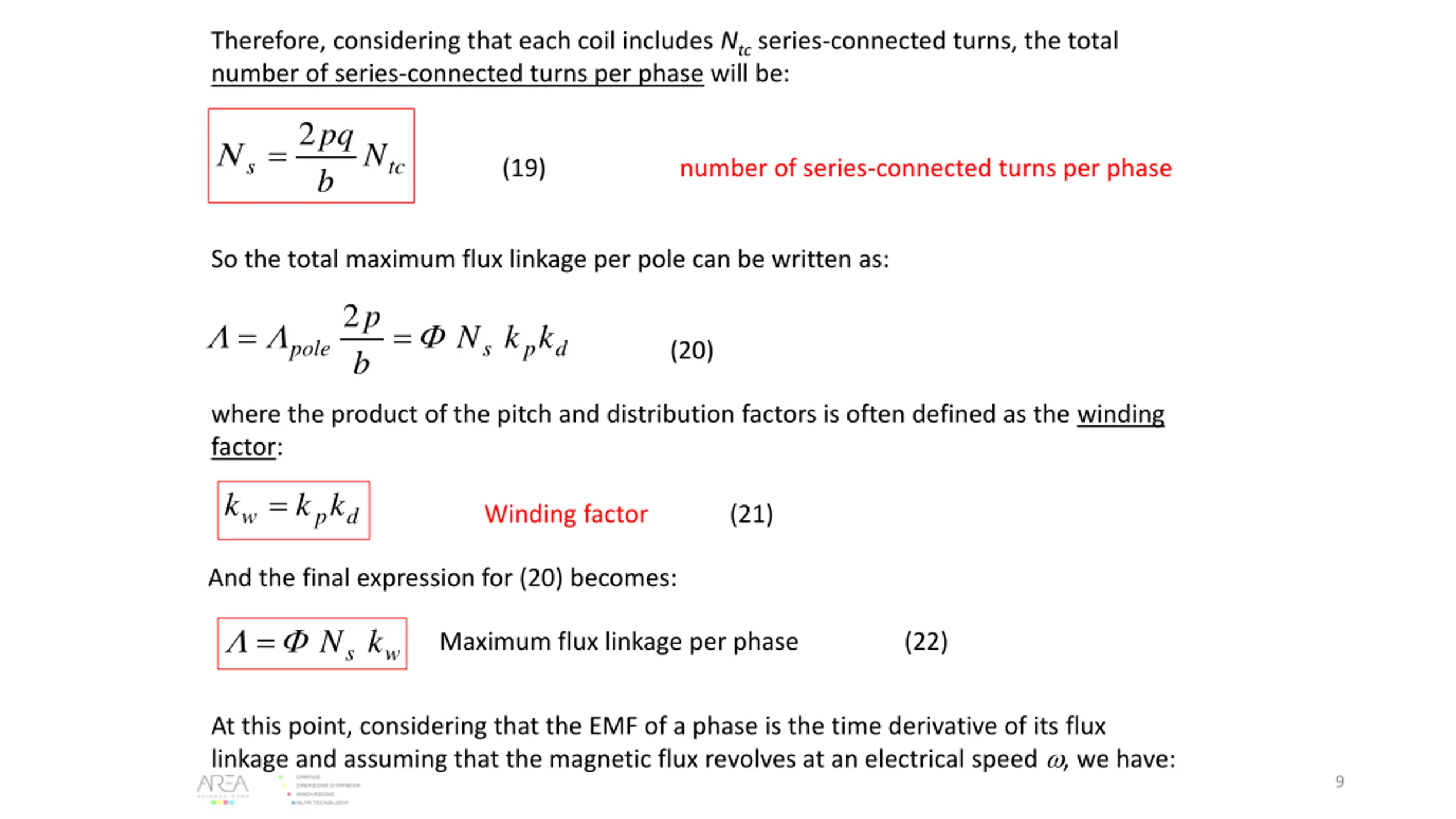Therefore, considering that each coil includes Ntcseries-connected turns, the total number of series-connected turns per phase will be: 2 pq = N s tc (19) number of series-connected turns per phase b So the total maximum flux linkage per pole can be written as: 2 p = = N k k pole s p d (20) b where the product of the pitch and distribution factors is often defined as the winding factor: k = k k Winding factor (21) w p d And the final expression for (20) becomes: = N sk Maximum flux linkage per phase (22) w At this point, considering that the EMF of a phase is the time derivative of its flux linkage and assuming that the magnetic flux revolves at an electrical speed , we have: 9