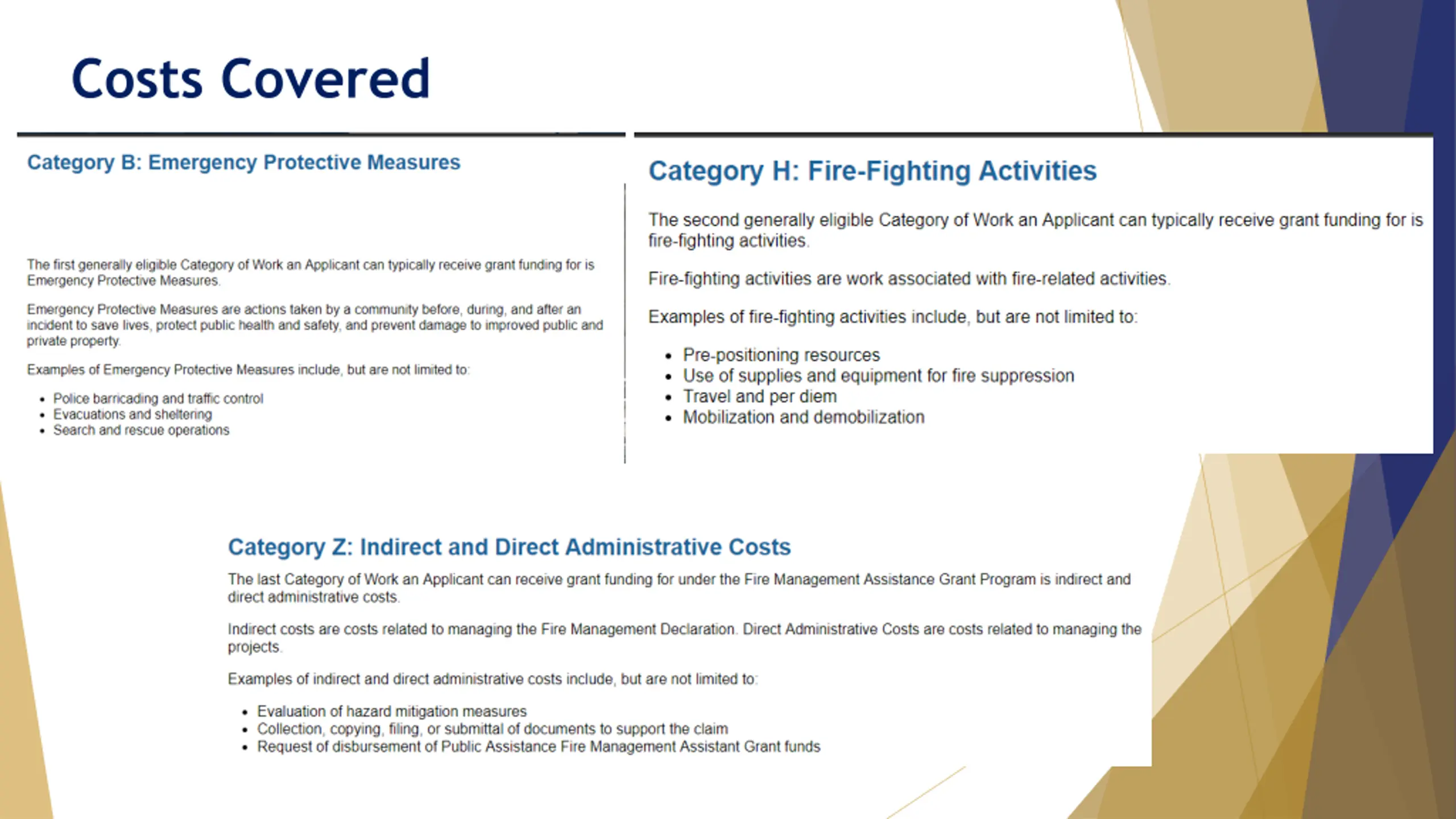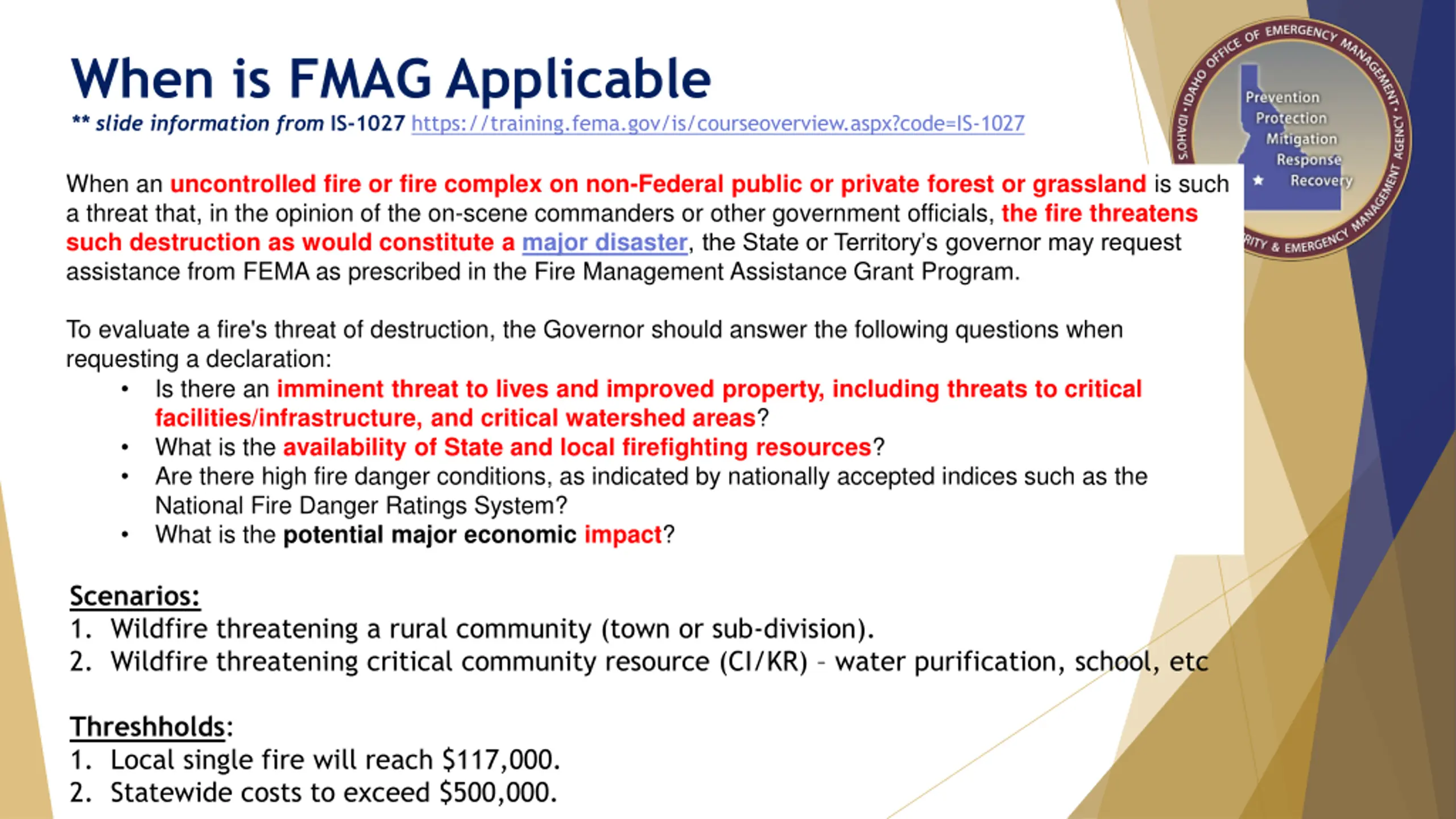 When is FMAG Applicable ** slide information from IS-1027 https://training.fema.gov/is/courseoverview.aspx?code=IS-1027 When an uncontrolled fire or fire complex on non-Federal public or private forest or grassland is such a threat that, in the opinion of the on-scene commanders or other government officials, the fire threatens such destruction as would constitute a major disaster, the State or Territory s governor may request assistance from FEMA as prescribed in the Fire Management Assistance Grant Program. To evaluate a fire's threat of destruction, the Governor should answer the following questions when requesting a declaration: Is there an imminent threat to lives and improved property, including threats to critical facilities/infrastructure, and critical watershed areas? What is the availability of State and local firefighting resources? Are there high fire danger conditions, as indicated by nationally accepted indices such as the National Fire Danger Ratings System? What is the potential major economic impact? Scenarios: 1. Wildfire threatening a rural community (town or sub-division). 2. Wildfire threatening critical community resource (CI/KR) water purification, school, etc Threshholds: 1. Local single fire will reach $117,000. 2. Statewide costs to exceed $500,000.