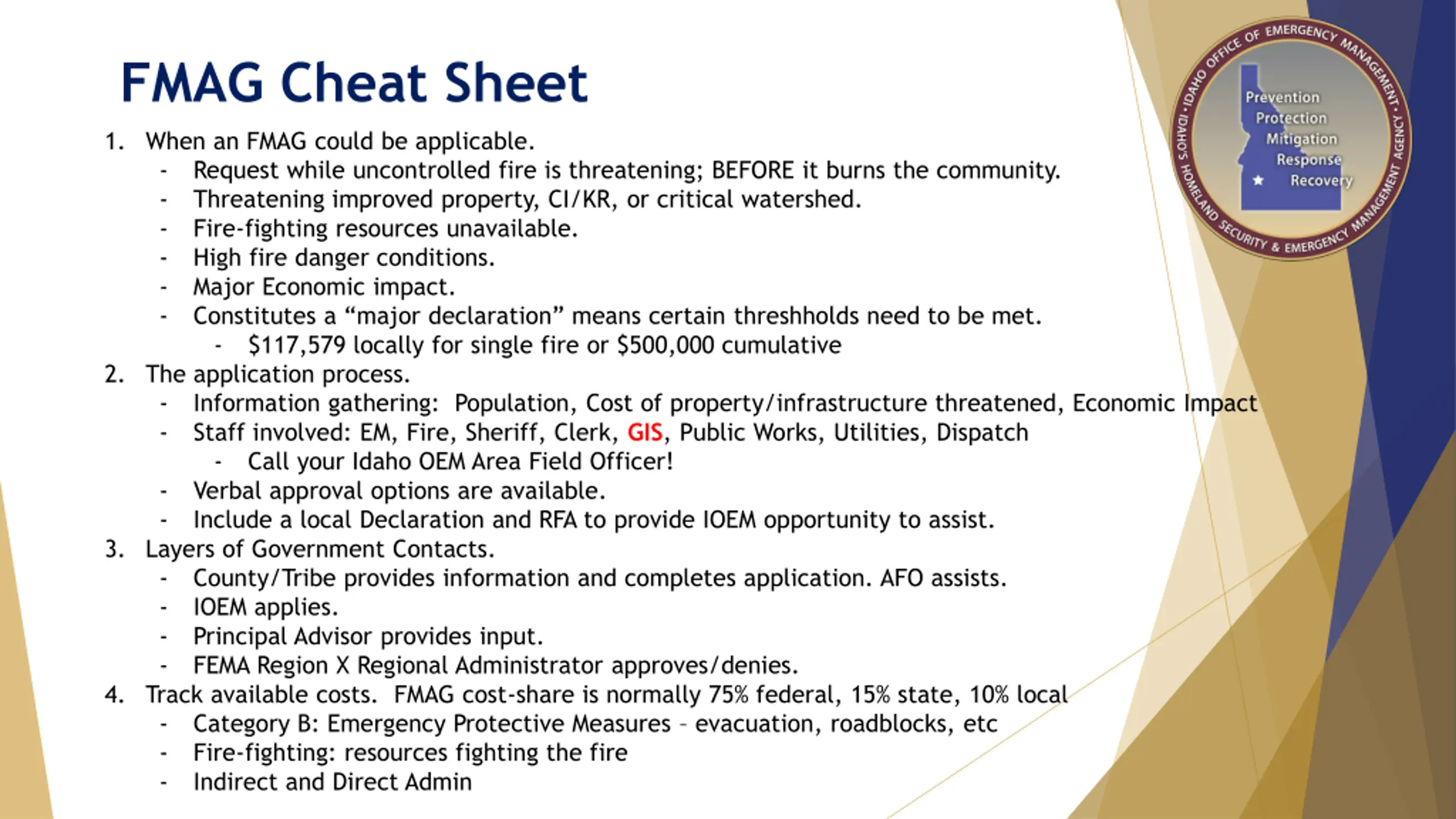 FMAG Cheat Sheet 1. When an FMAG could be applicable. - Request while uncontrolled fire is threatening; BEFORE it burns the community. - Threatening improved property, CI/KR, or critical watershed. - Fire-fighting resources unavailable. - High fire danger conditions. - Major Economic impact. - Constitutes a major declaration means certain threshholds need to be met. - $117,579 locally for single fire or $500,000 cumulative 2. The application process. - Information gathering: Population, Cost of property/infrastructure threatened, Economic Impact - Staff involved: EM, Fire, Sheriff, Clerk, GIS, Public Works, Utilities, Dispatch - Call your Idaho OEM Area Field Officer! - Verbal approval options are available. - Include a local Declaration and RFA to provide IOEM opportunity to assist. 3. Layers of Government Contacts. - County/Tribe provides information and completes application. AFO assists. - IOEM applies. - Principal Advisor provides input. - FEMA Region X Regional Administrator approves/denies. 4. Track available costs. FMAG cost-share is normally 75% federal, 15% state, 10% local - Category B: Emergency Protective Measures evacuation, roadblocks, etc - Fire-fighting: resources fighting the fire - Indirect and Direct Admin
