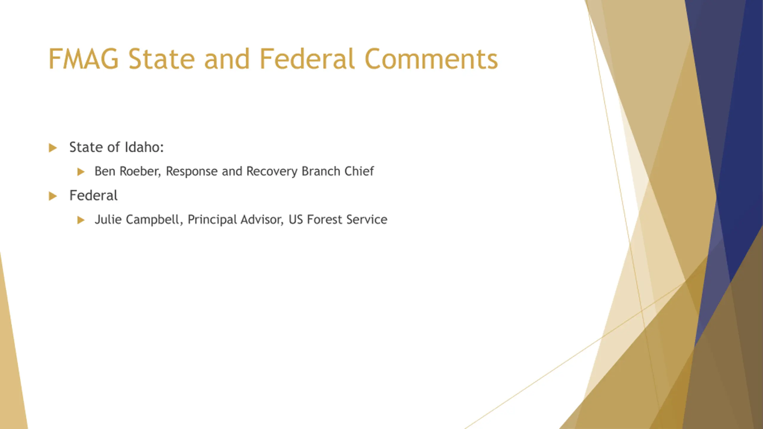 FMAG State and Federal Comments State of Idaho: Ben Roeber, Response and Recovery Branch Chief Federal Julie Campbell, Principal Advisor, US Forest Service