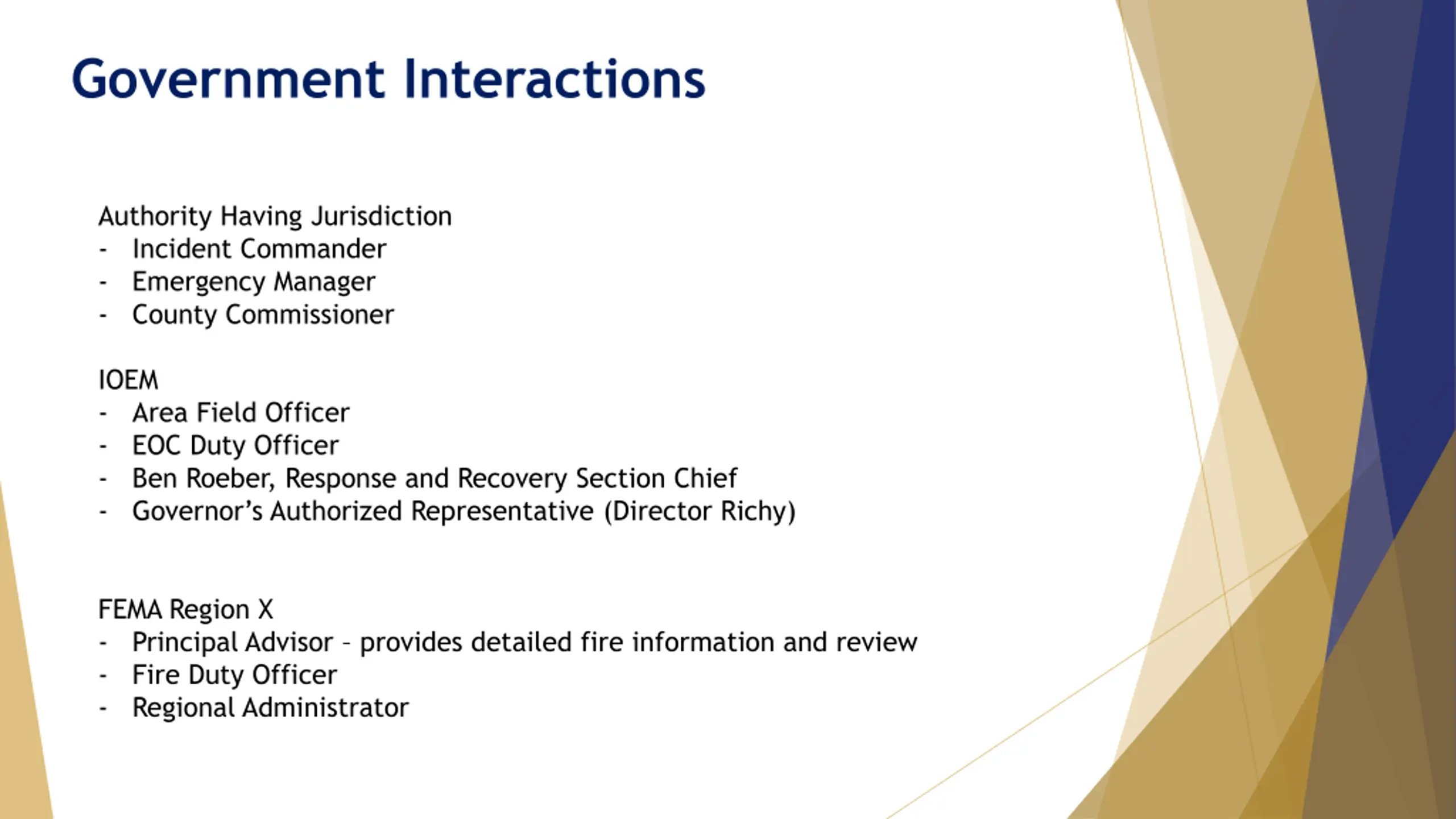 Government Interactions Authority Having Jurisdiction - Incident Commander - Emergency Manager - County Commissioner IOEM - Area Field Officer - EOC Duty Officer - Ben Roeber, Response and Recovery Section Chief - Governor s Authorized Representative (Director Richy) FEMA Region X - Principal Advisor provides detailed fire information and review - Fire Duty Officer - Regional Administrator