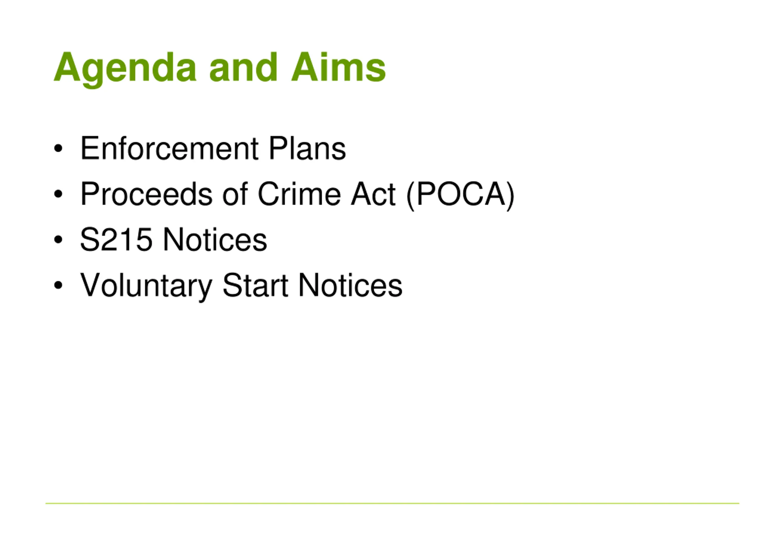 Agenda and Aims Enforcement Plans Proceeds of Crime Act (POCA) S215 Notices Voluntary Start Notices