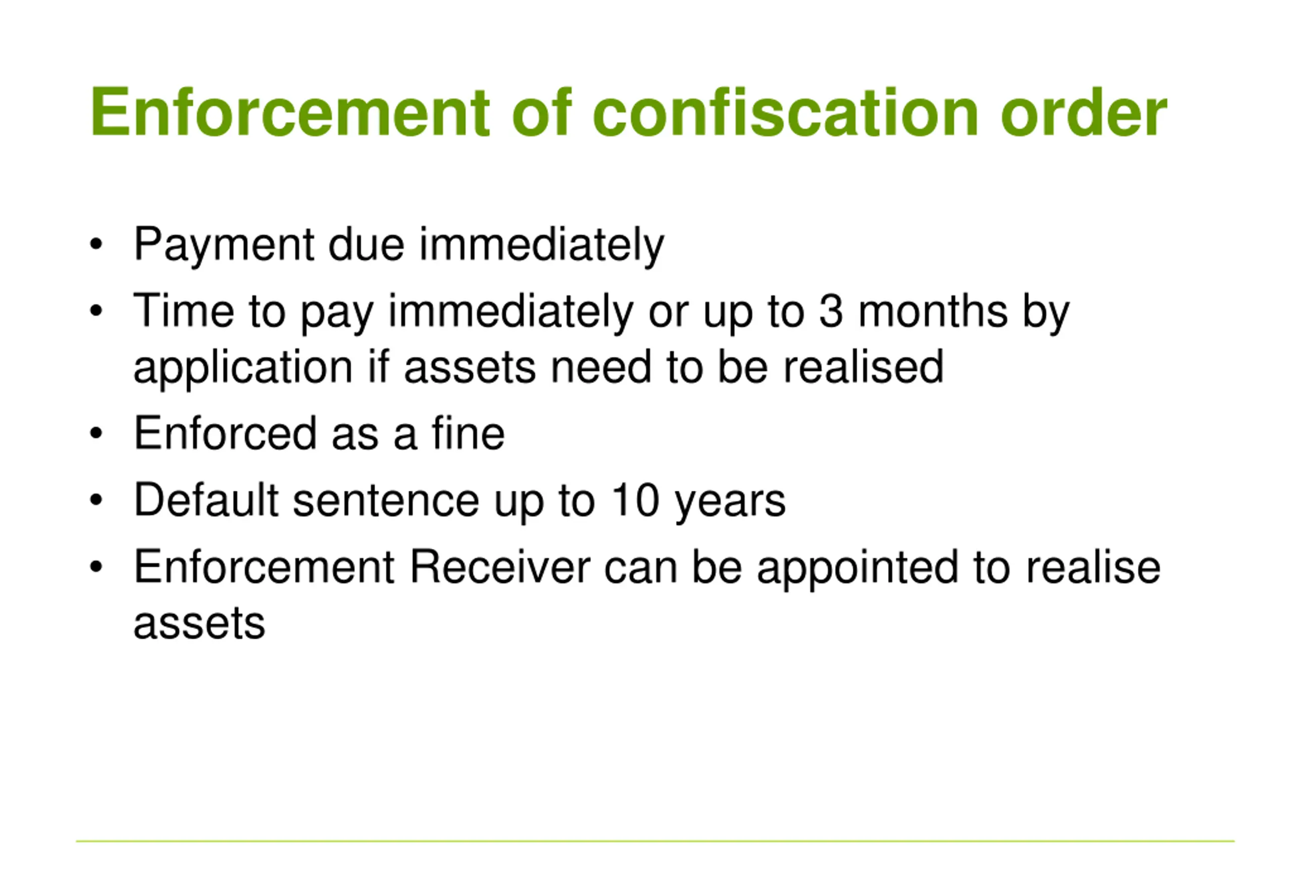 Enforcement of confiscation order Payment due immediately Time to pay immediately or up to 3 months by application if assets need to be realised Enforced as a fine Default sentence up to 10 years Enforcement Receiver can be appointed to realise assets