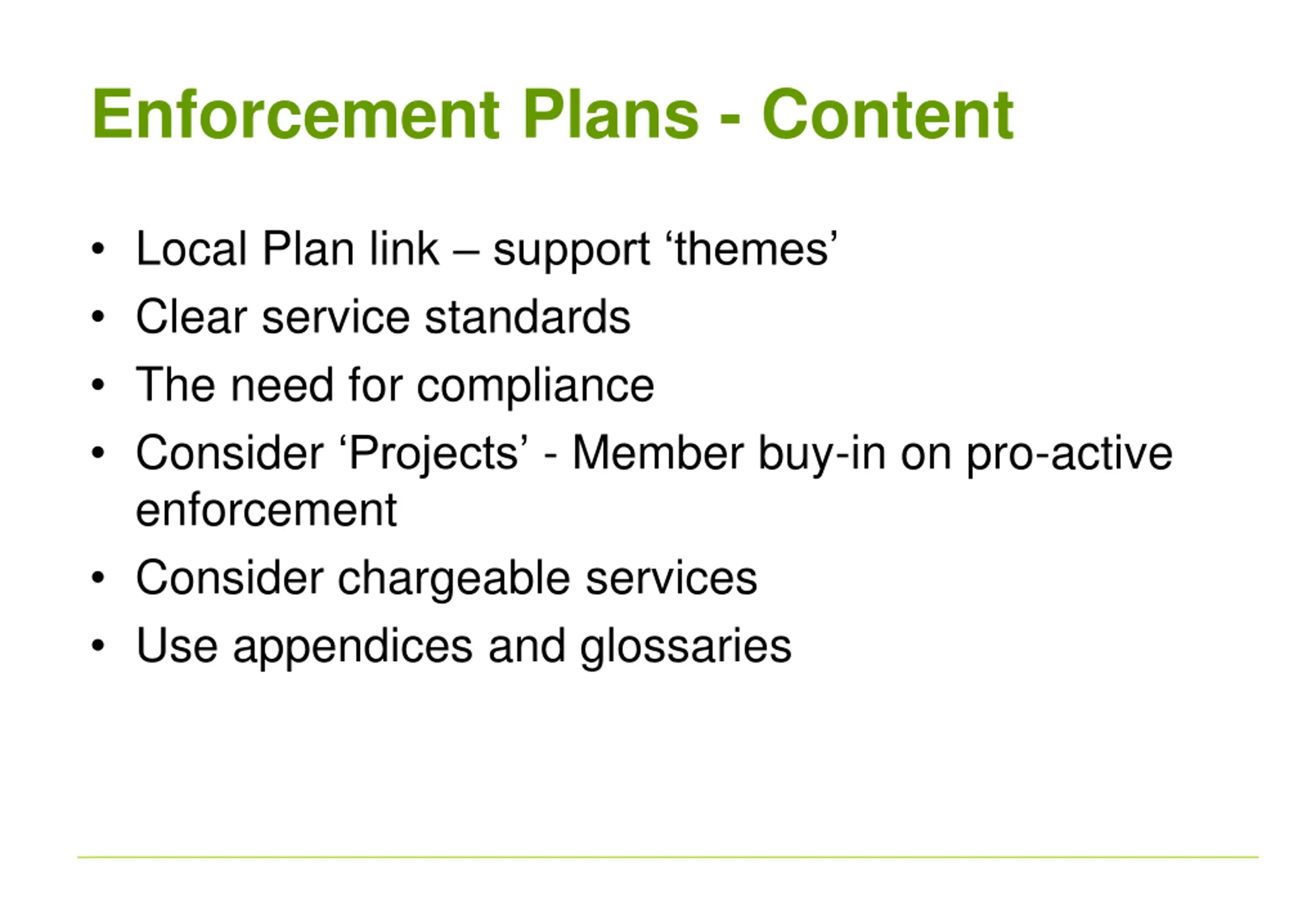 Enforcement Plans - Content Local Plan link support themes Clear service standards The need for compliance Consider Projects - Member buy-in on pro-active enforcement Consider chargeable services Use appendices and glossaries