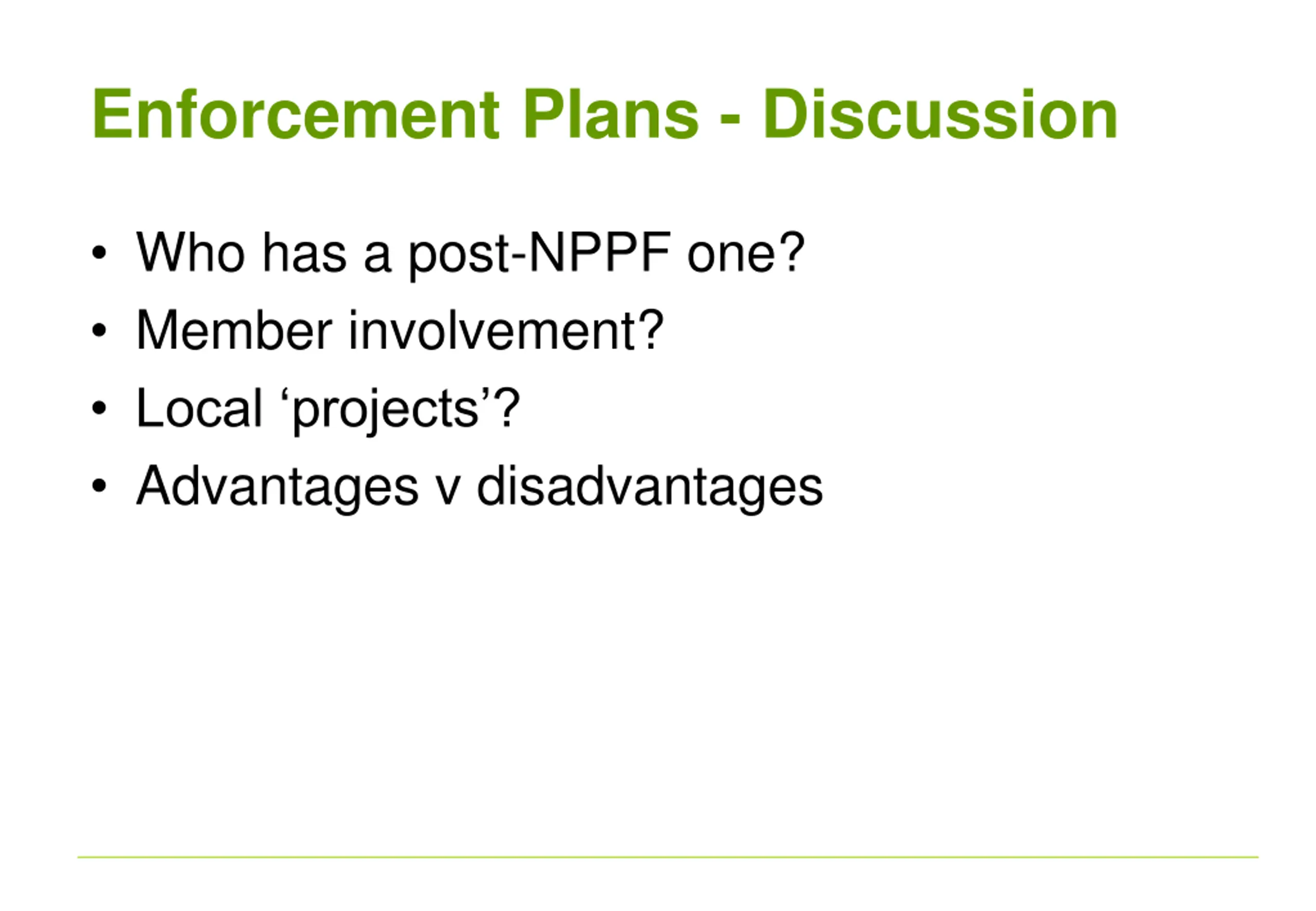 Enforcement Plans - Discussion Who has a post-NPPF one? Member involvement? Local projects ? Advantages v disadvantages