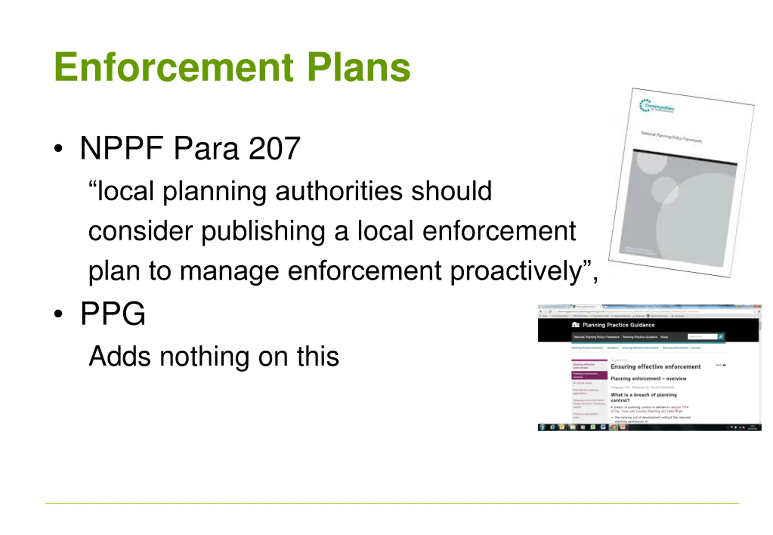 Enforcement Plans NPPF Para 207 local planning authorities should consider publishing a local enforcement plan to manage enforcement proactively , PPG Adds nothing on this