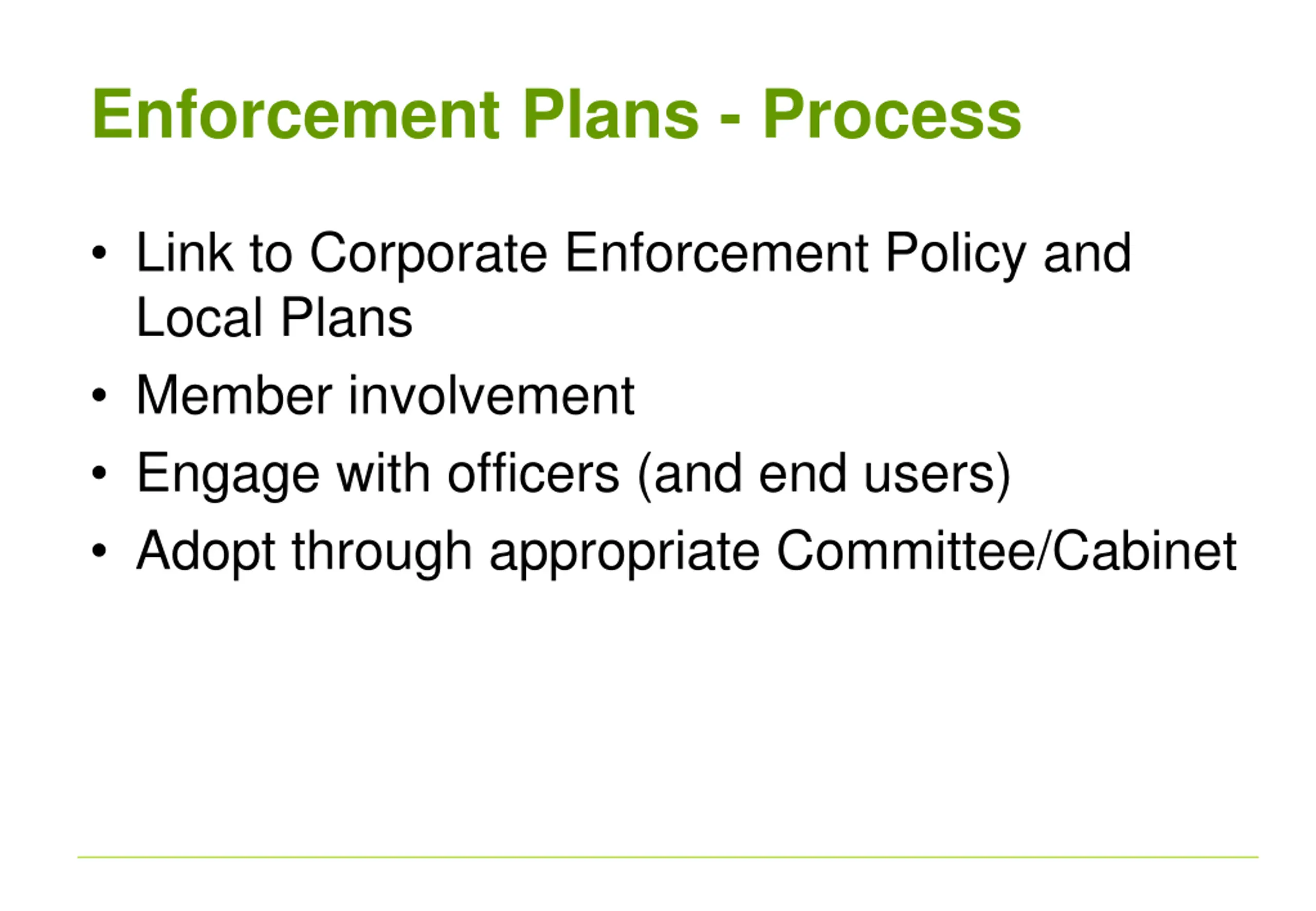 Enforcement Plans - Process Link to Corporate Enforcement Policy and Local Plans Member involvement Engage with officers (and end users) Adopt through appropriate Committee/Cabinet