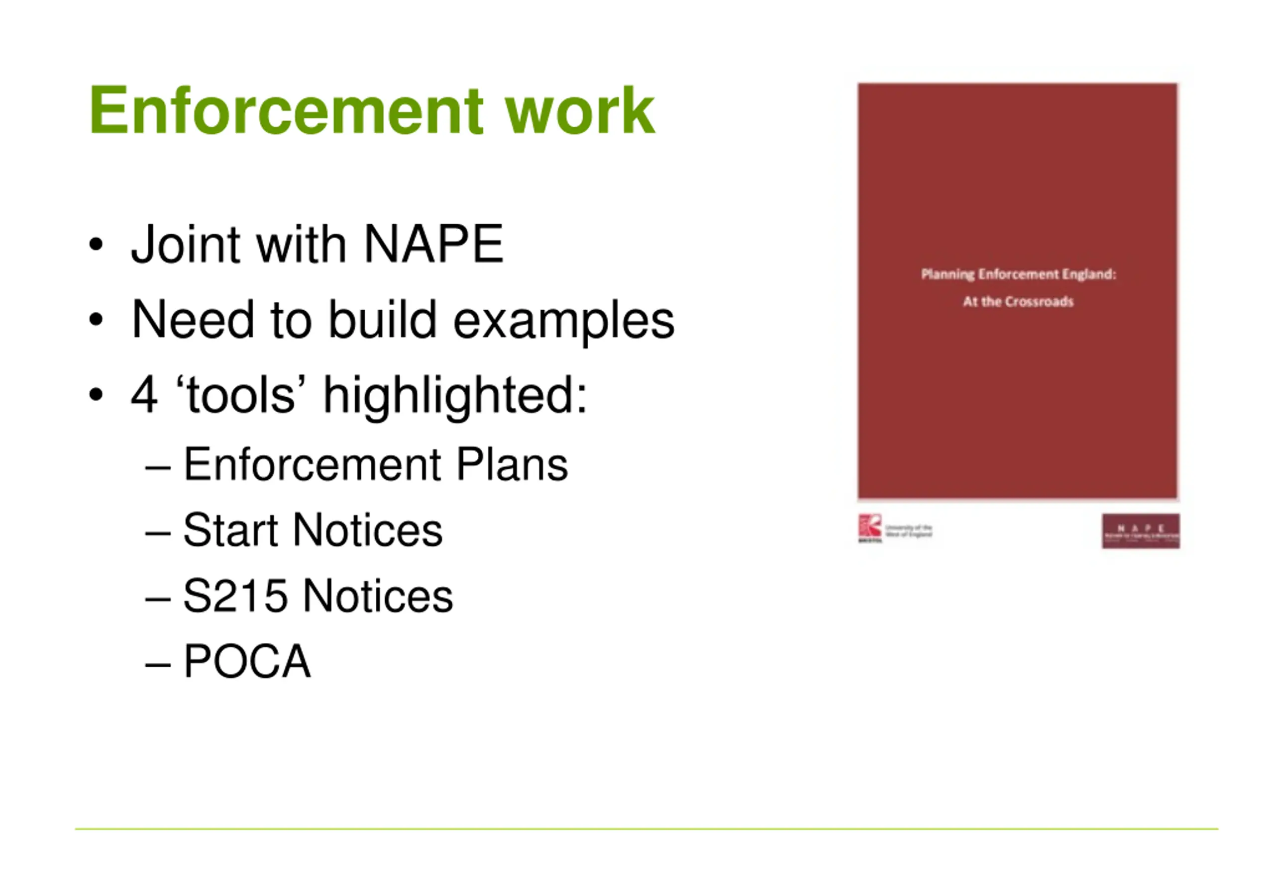 Enforcement work Joint with NAPE Need to build examples 4 tools highlighted: Enforcement Plans Start Notices S215 Notices POCA