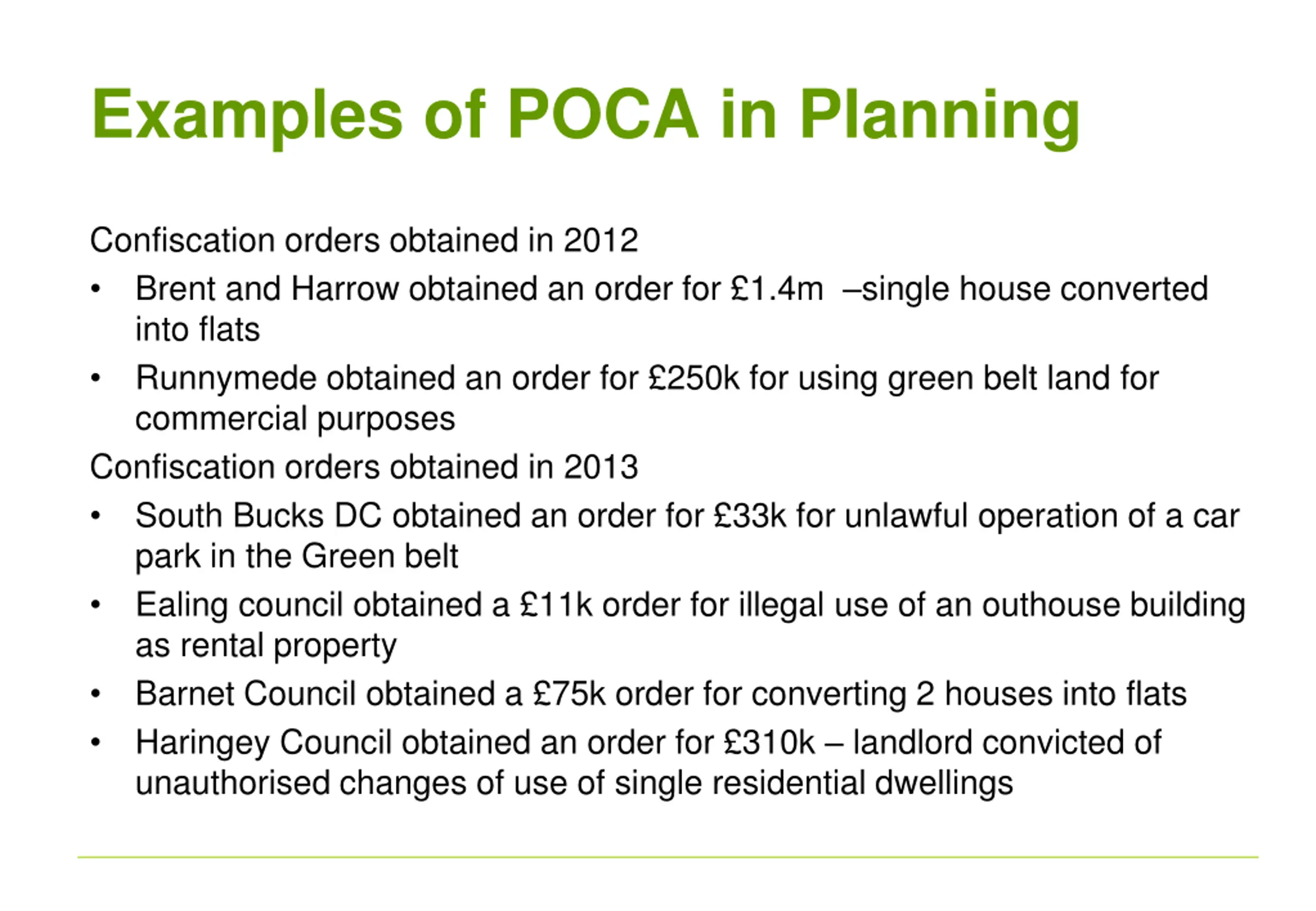 Examples of POCA in Planning Confiscation orders obtained in 2012 Brent and Harrow obtained an order for 1.4m single house converted into flats Runnymede obtained an order for 250k for using green belt land for commercial purposes Confiscation orders obtained in 2013 South Bucks DC obtained an order for 33k for unlawful operation of a car park in the Green belt Ealing council obtained a 11k order for illegal use of an outhouse building as rental property Barnet Council obtained a 75k order for converting 2 houses into flats Haringey Council obtained an order for 310k landlord convicted of unauthorised changes of use of single residential dwellings