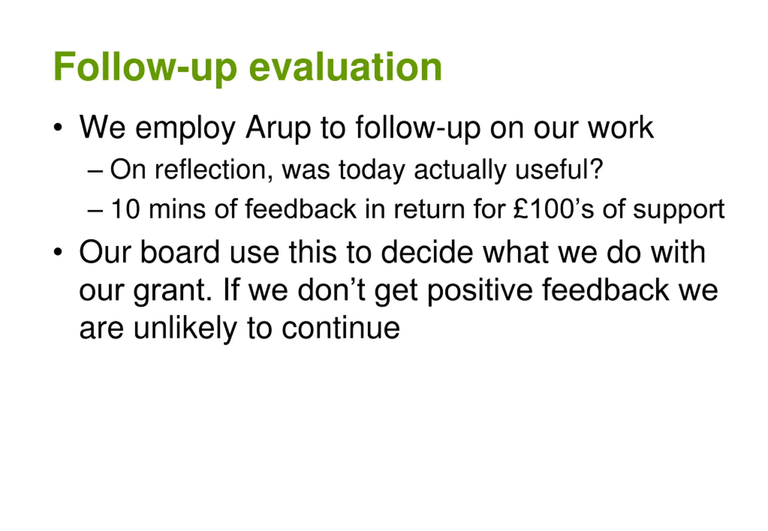 Follow-up evaluation We employ Arup to follow-up on our work On reflection, was today actually useful? 10 mins of feedback in return for 100 s of support Our board use this to decide what we do with our grant. If we don t get positive feedback we are unlikely to continue