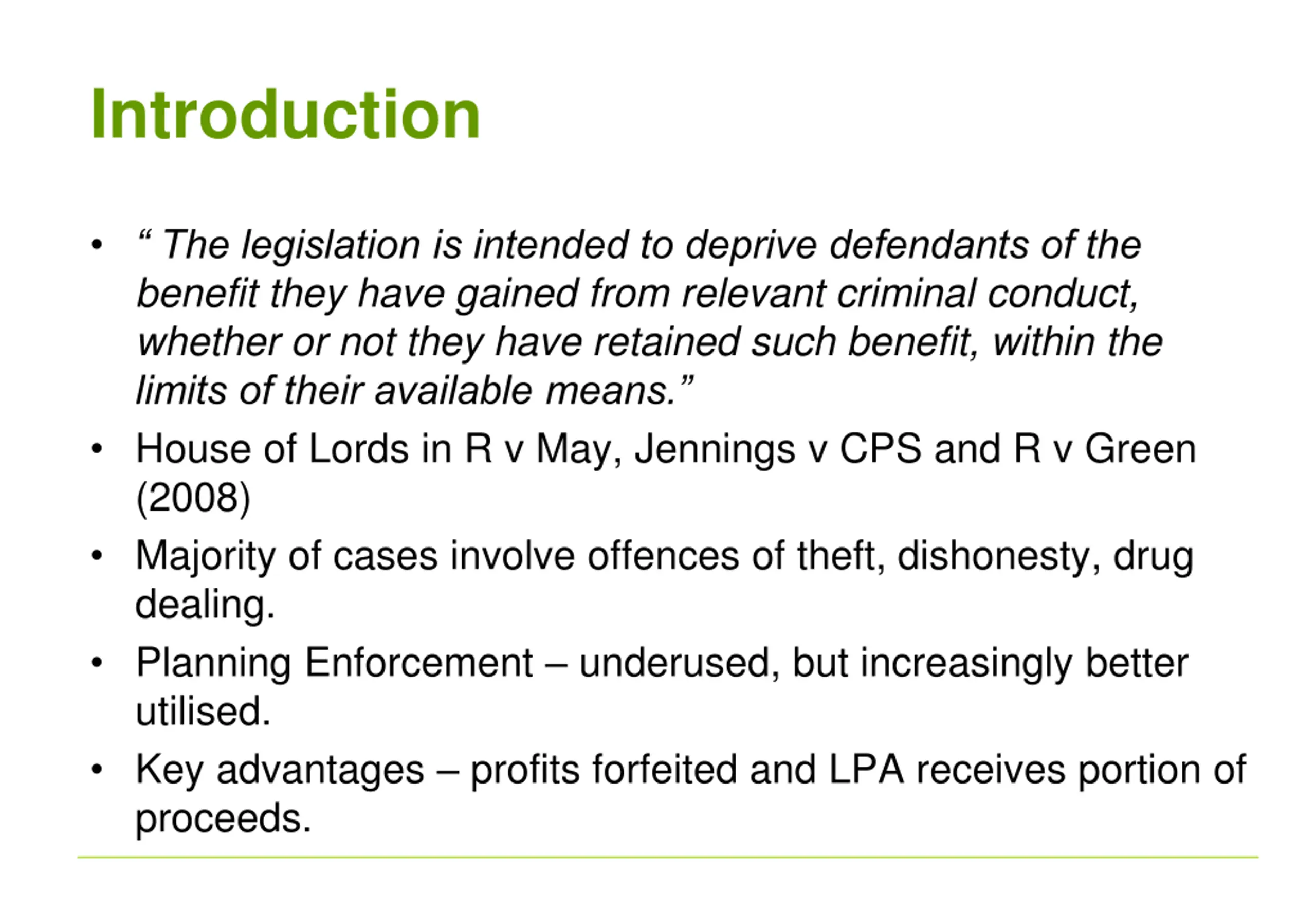 Introduction The legislation is intended to deprive defendants of the benefit they have gained from relevant criminal conduct, whether or not they have retained such benefit, within the limits of their available means. House of Lords in R v May, Jennings v CPS and R v Green (2008) Majority of cases involve offences of theft, dishonesty, drug dealing. Planning Enforcement underused, but increasingly better utilised. Key advantages profits forfeited and LPA receives portion of proceeds.