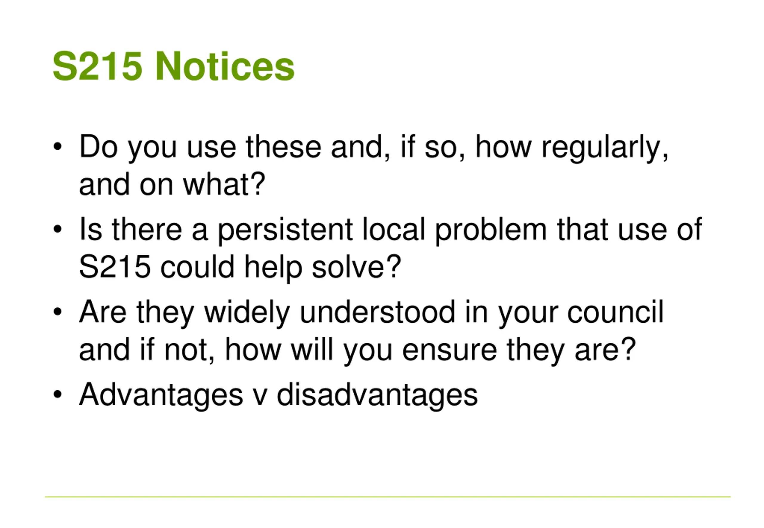 S215 Notices Do you use these and, if so, how regularly, and on what? Is there a persistent local problem that use of S215 could help solve? Are they widely understood in your council and if not, how will you ensure they are? Advantages v disadvantages