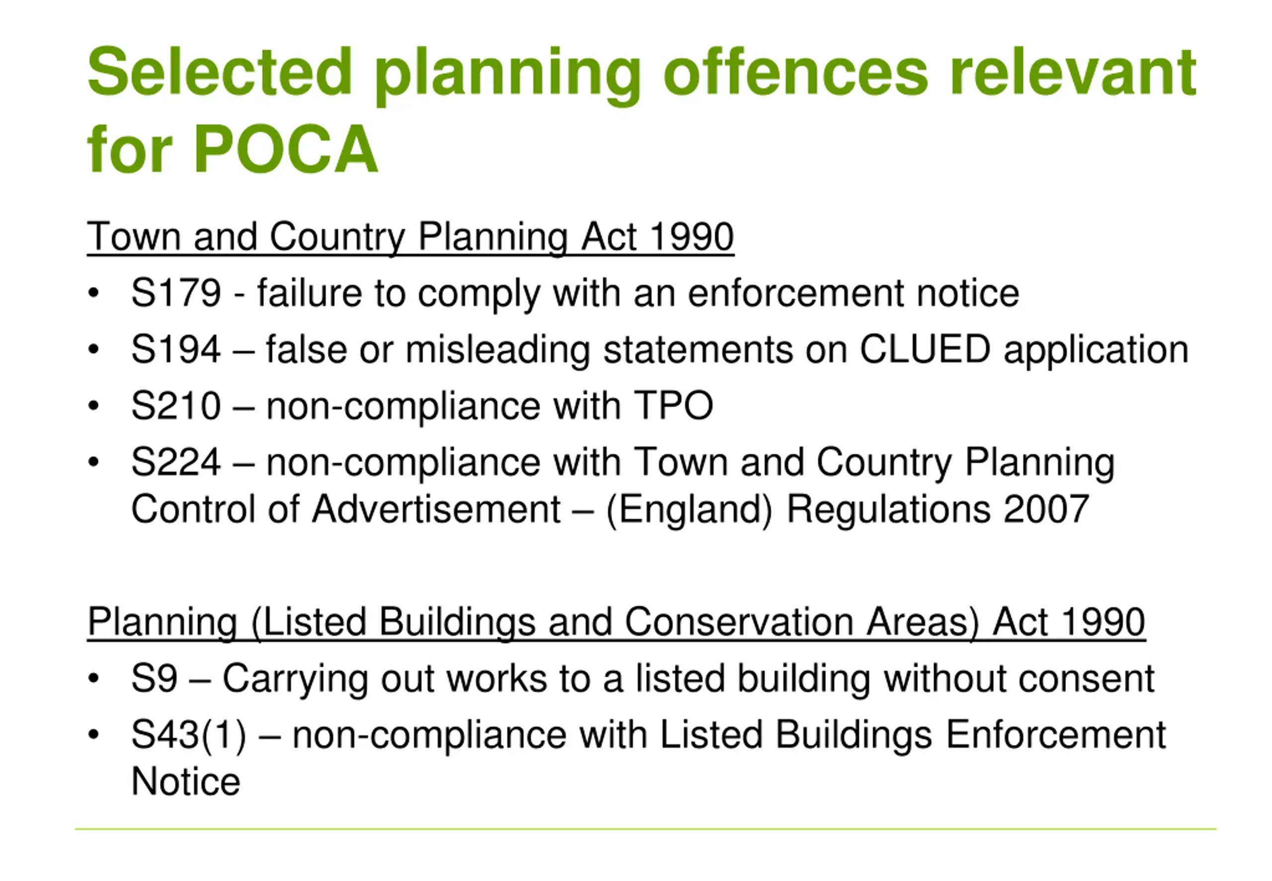 Selected planning offences relevant for POCA Town and Country Planning Act 1990 S179 - failure to comply with an enforcement notice S194 false or misleading statements on CLUED application S210 non-compliance with TPO S224 non-compliance with Town and Country Planning Control of Advertisement (England) Regulations 2007 Planning (Listed Buildings and Conservation Areas) Act 1990 S9 Carrying out works to a listed building without consent S43(1) non-compliance with Listed Buildings Enforcement Notice