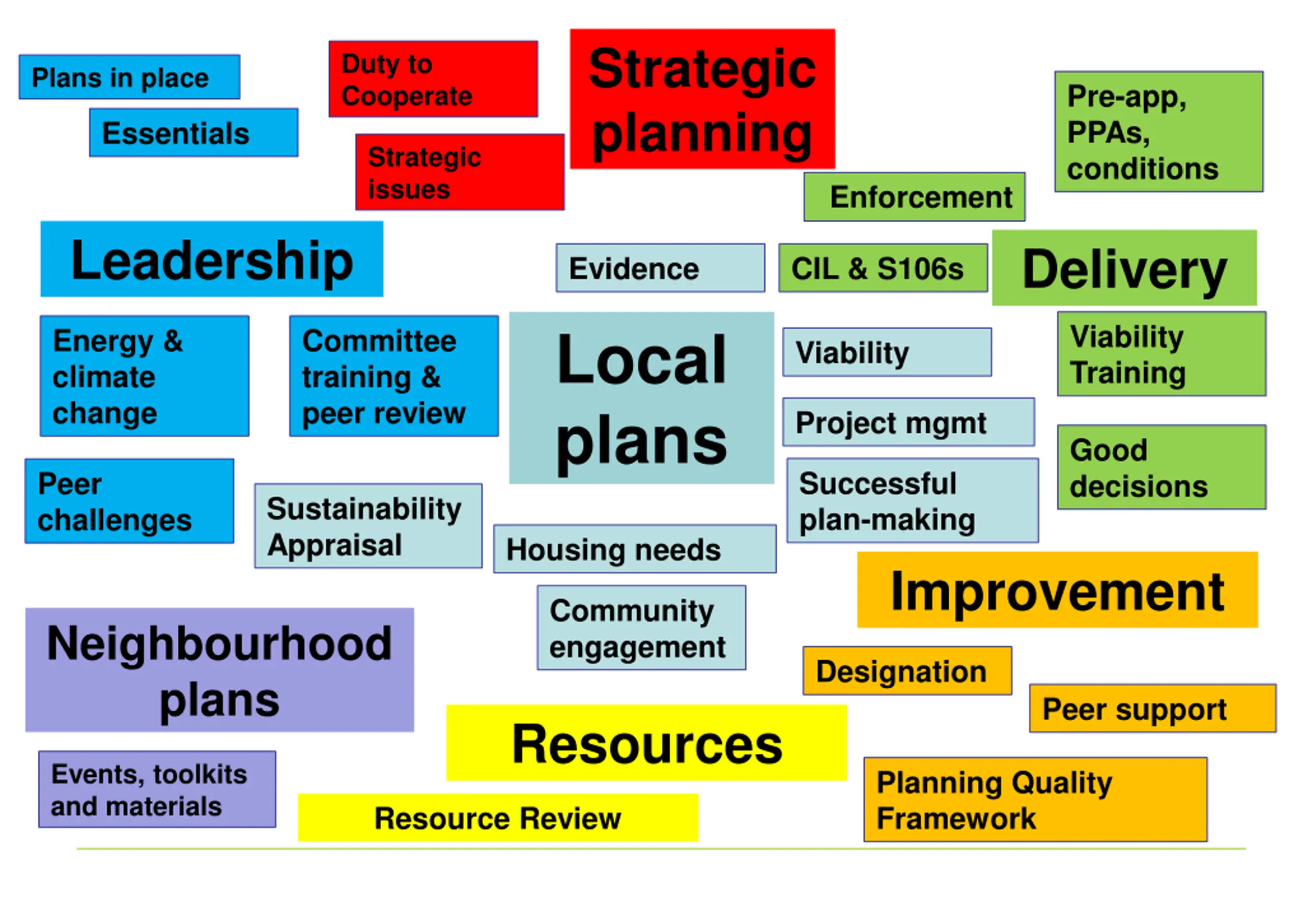 Strategic planning Duty to Cooperate Plans in place Pre-app, PPAs, conditions Essentials Strategic issues Enforcement Leadership Delivery Evidence CIL & S106s Viability Training Local plans Energy & climate change Committee training & peer review Viability Project mgmt Good decisions Successful plan-making Peer challenges Sustainability Appraisal Housing needs Improvement Community engagement Neighbourhood plans Designation Peer support Resources Events, toolkits and materials Planning Quality Framework Resource Review