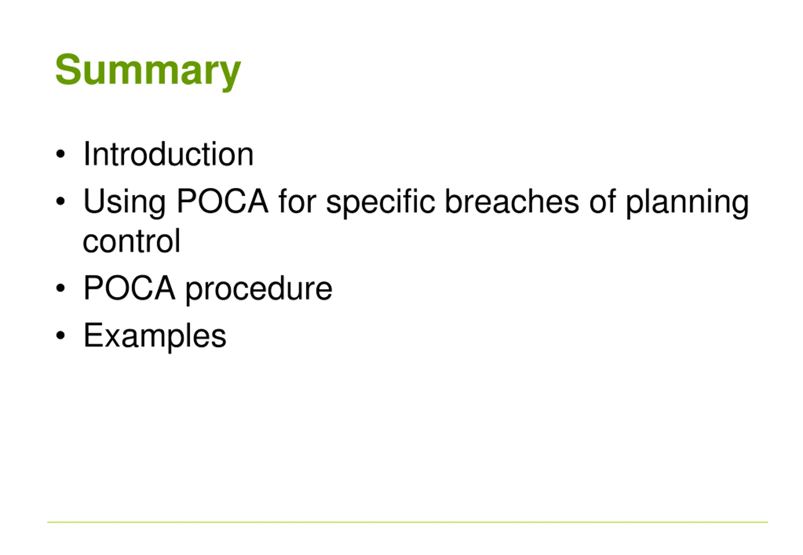 Summary Introduction Using POCA for specific breaches of planning control POCA procedure Examples