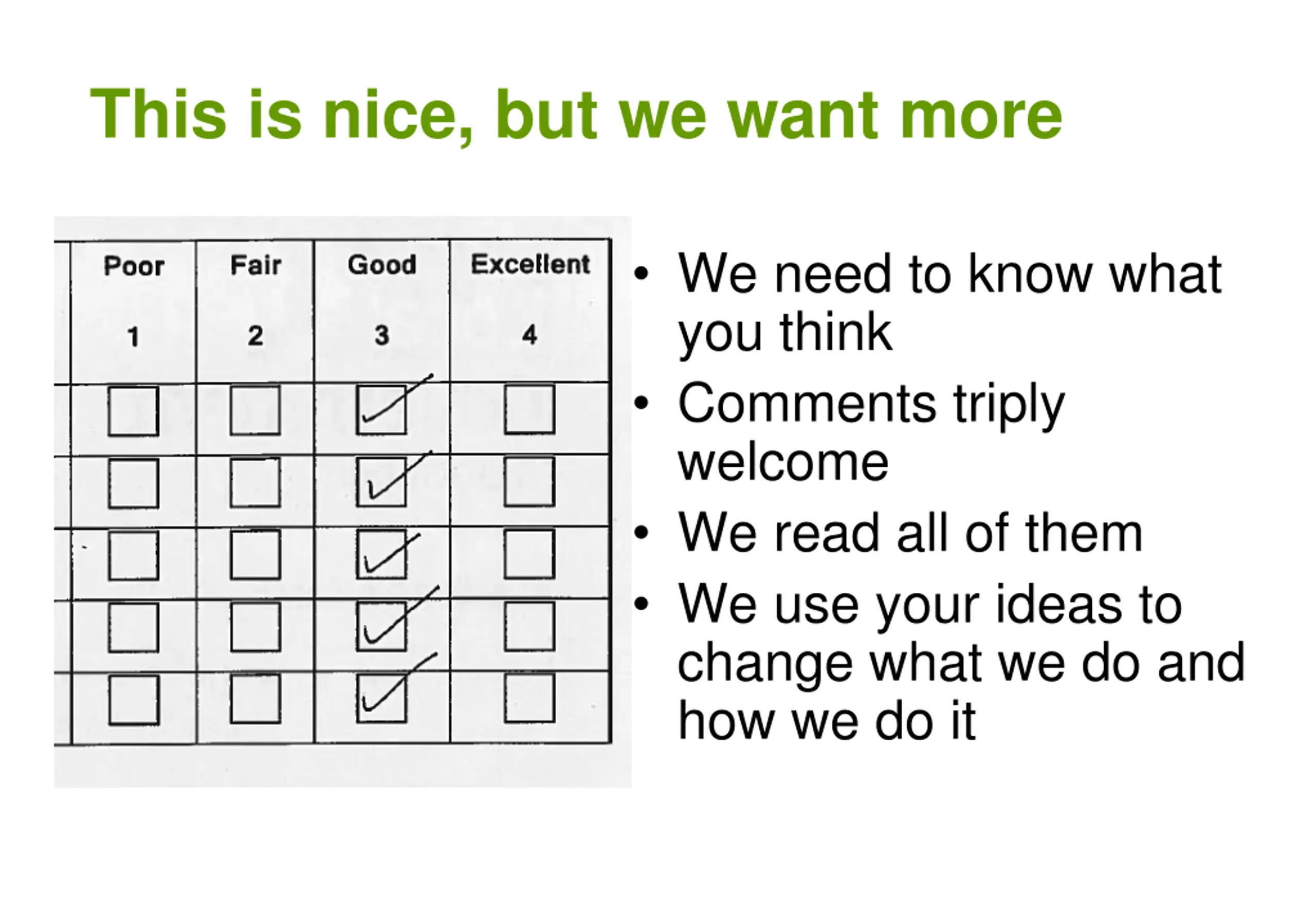 This is nice, but we want more We need to know what you think Comments triply welcome We read all of them We use your ideas to change what we do and how we do it