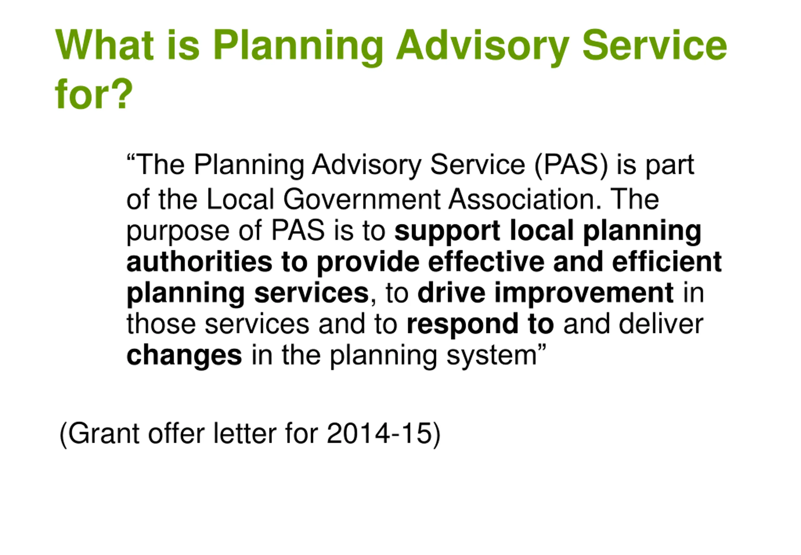 The Planning Advisory Service We Are funded by 2m from DCLG to the LGA Work for English Planning Authorities Have been around ever since 2005 (Planning Act) and subsequent reform Reduce cost, risk and delay through pilots, toolkits, Q&A We are not A thinktank, experts , a lobby group or researchers