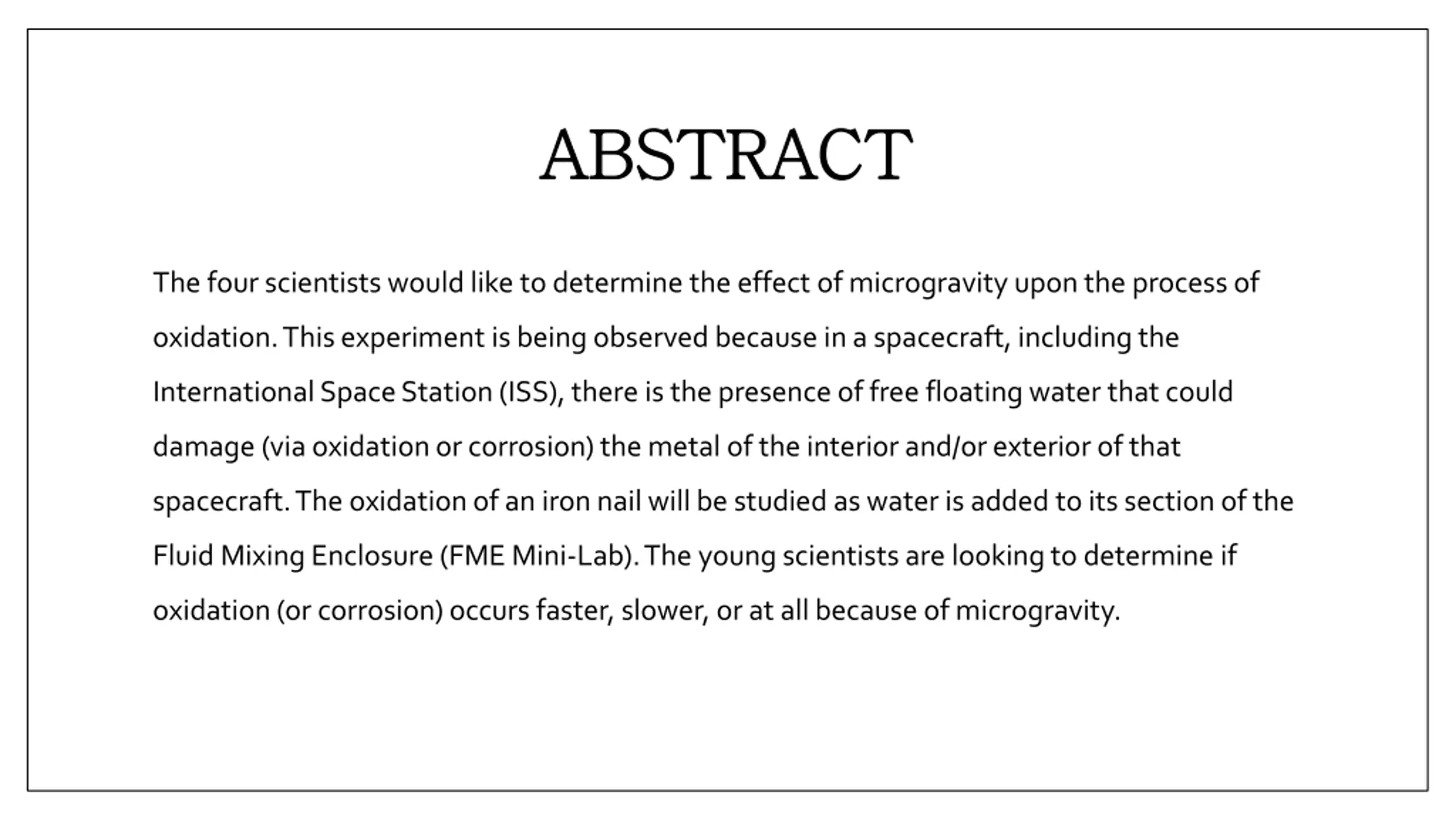 ABSTRACT ABSTRACT The four scientists would like to determine the effect of microgravity upon the process of oxidation. This experiment is being observed because in a spacecraft, including the International Space Station (ISS), there is the presence of free floating water that could damage (via oxidation or corrosion) the metal of the interior and/or exterior of that spacecraft. The oxidation of an iron nail will be studied as water is added to its section of the Fluid Mixing Enclosure (FME Mini-Lab). The young scientists are looking to determine if oxidation (or corrosion) occurs faster, slower, or at all because of microgravity.